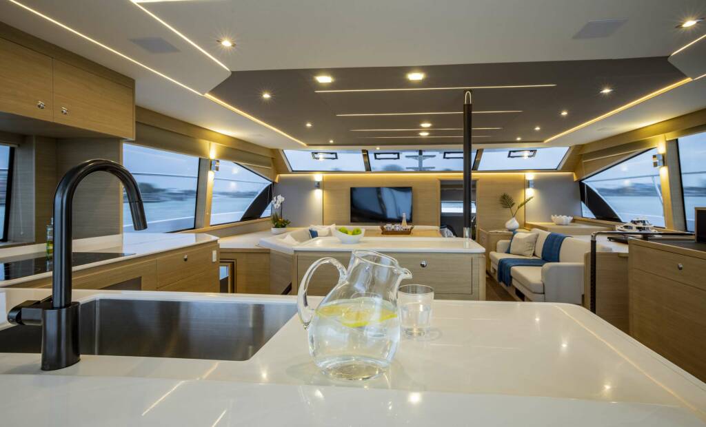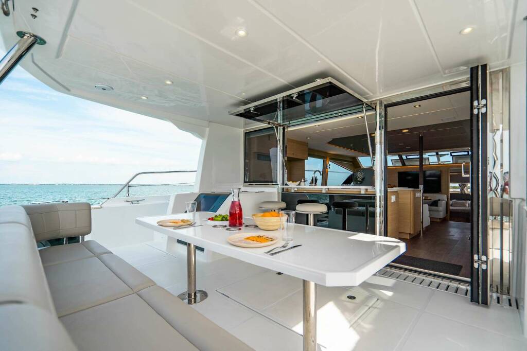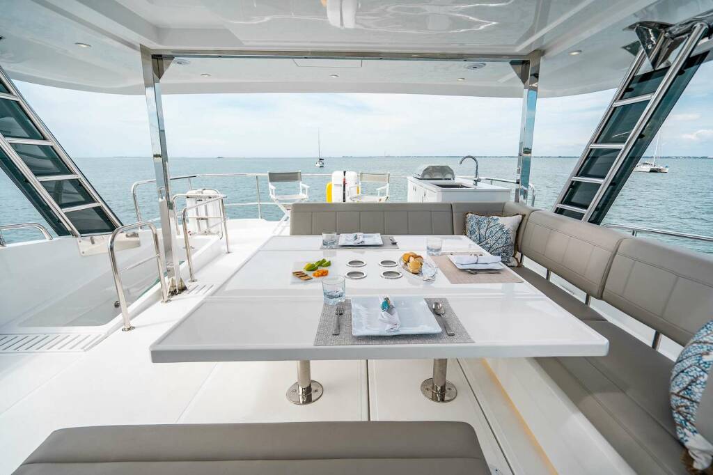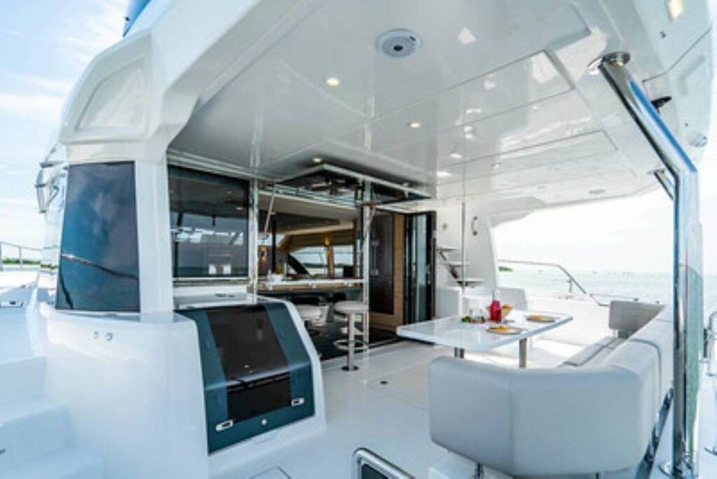 When the sun has set and you are ready to rest, you will feel at home in our spacious and comfortable cabins. Each cabin is equipped with storage space for your belongings and a queen bed. (King in master) The galley and salon have a contemporary configuration and an open-concept space perfect for enjoying time with friends and family. A flat screen TV is placed on the back wall for viewing pleasure in and out of the salon at the barstool seating. Wi-Fi is also included should you choose to stay connected on your dream vacation.