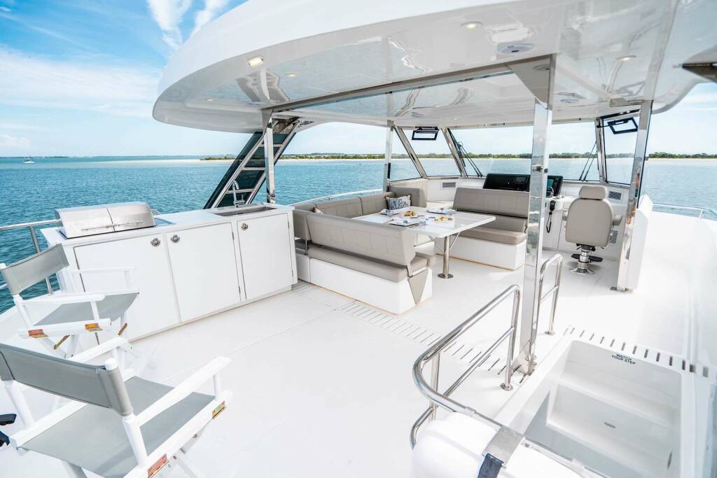 Other amenities include: lounging pads for sunbathing, electric grill located on the flybridge, electric winch-style dinghy lift platform, blue tooth capabilities, and sound system.