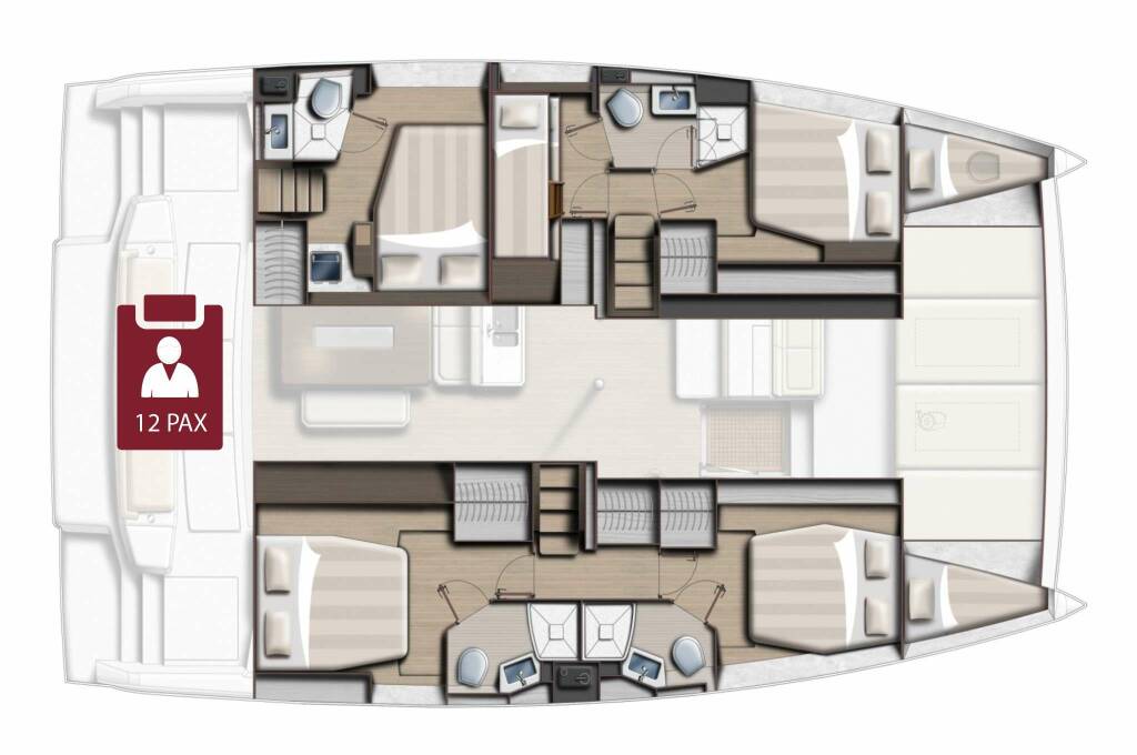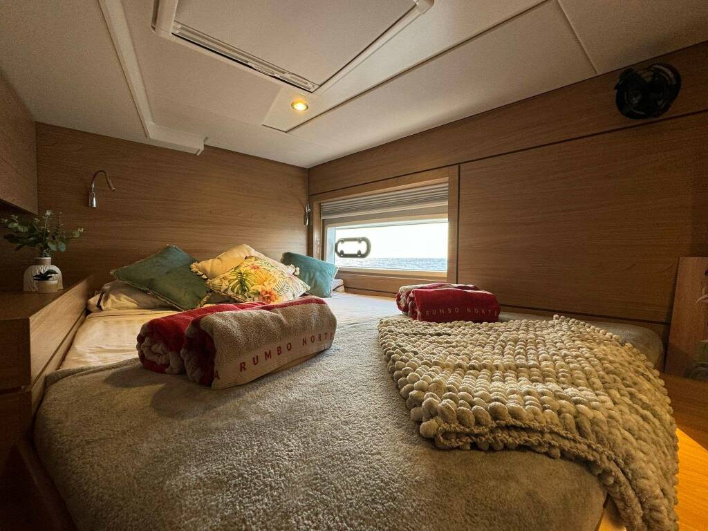 Accommodation: Featuring two master cabins located on the starboard bow and stern, two double cabins on the port bow and stern, and one twin-berth cabin amidships to port. The yacht offers four full bathrooms, three of which are en suite, each equipped with an electric shower, WC, hand basin with mixer tap, ample storage, and a large mirror.