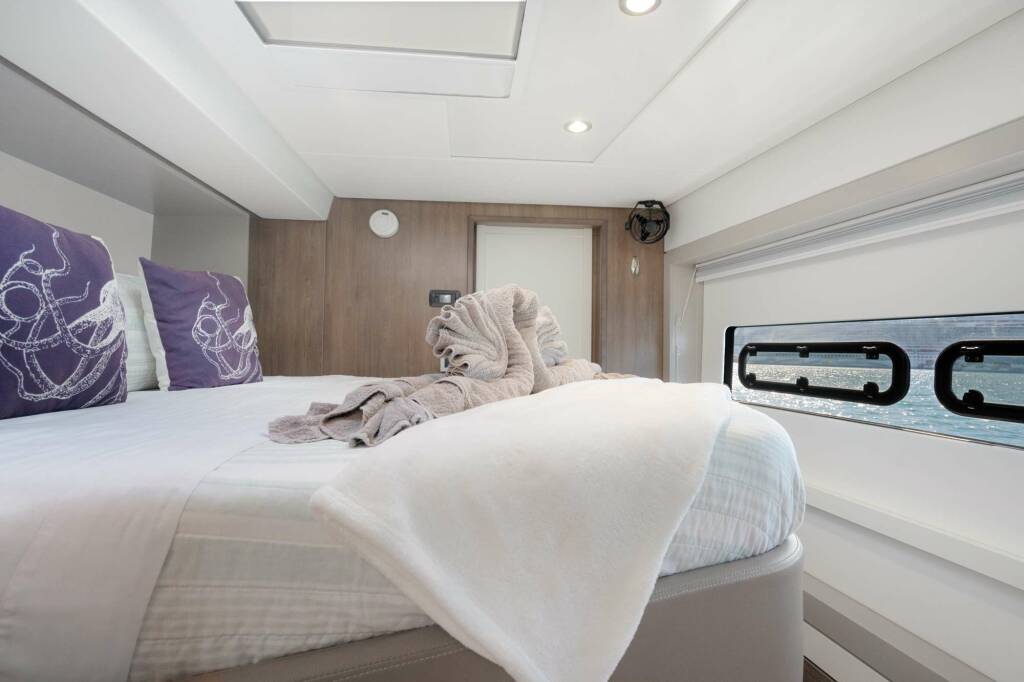 Accommodation: x1 master suite and x3 queen cabins, all equipped with en-suite bathrooms available for guests to use. 2 single forepeaks outfitted for use as well for an extra fee for guests or for crew cabin relocation.