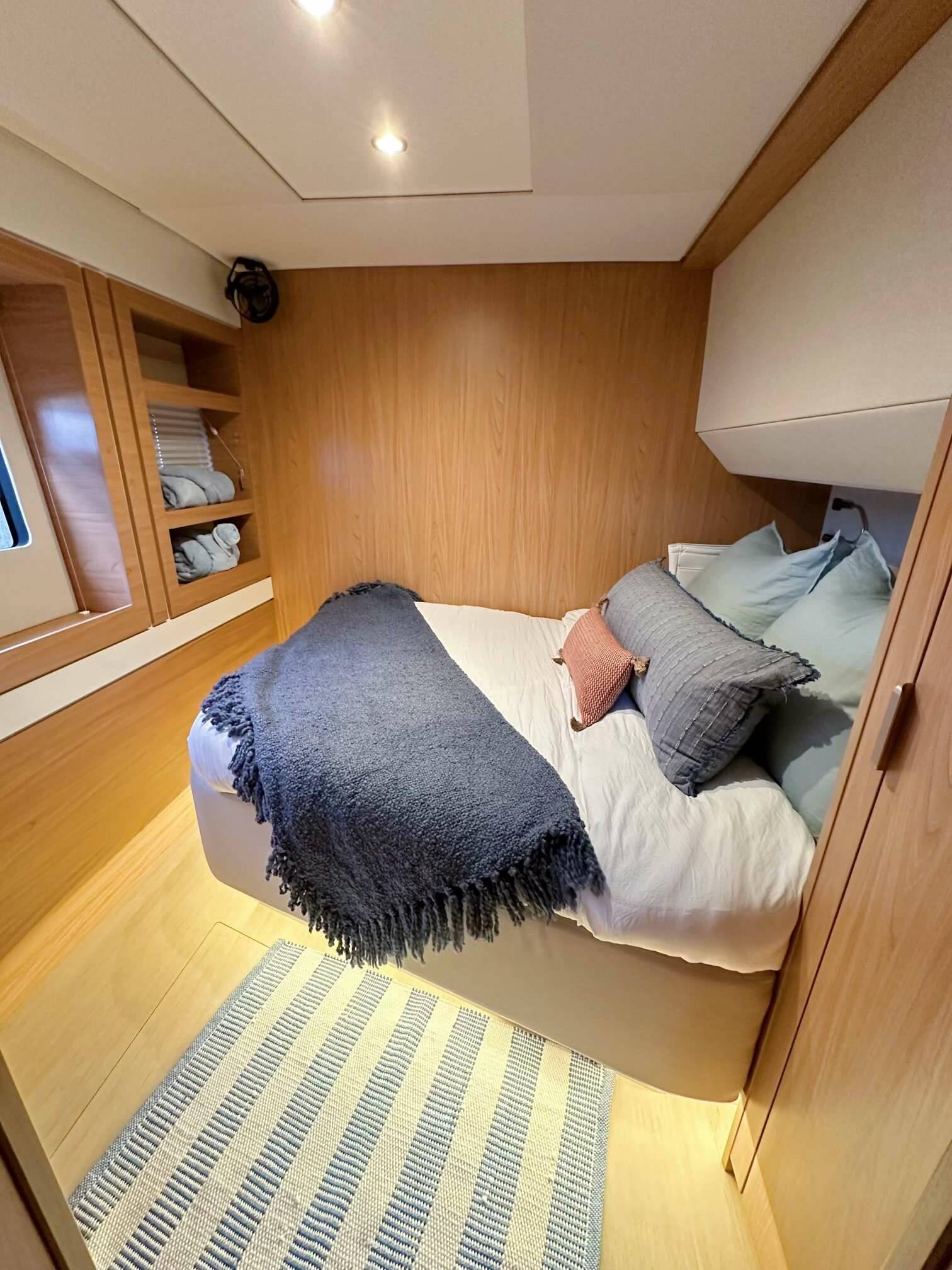 4 double cabins and 1 small single forepeak cabin. Forepeak Cabin is ideal for children or young teens. Port Fwd cabin only accessible via another guest cabin. Suitable only for family sharing.