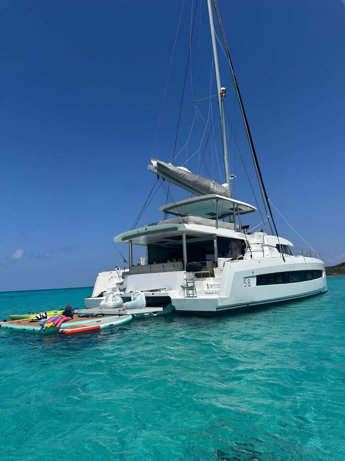 Luxus - Katamaran SNAPDRAGON, Baujahr 2025 liegt in Bahamas vor Anker. Sie hat 4 Kabinen, bietet Platz für 8 Personen.