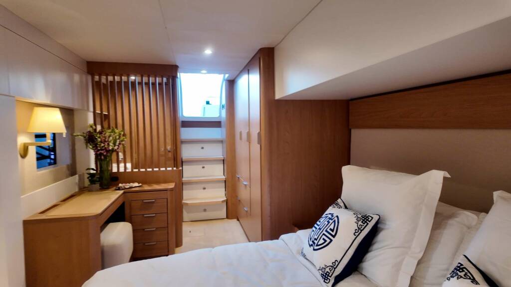 For guests, the yacht offers 1 king, 2 queens and a twin cabin (midship, port side).