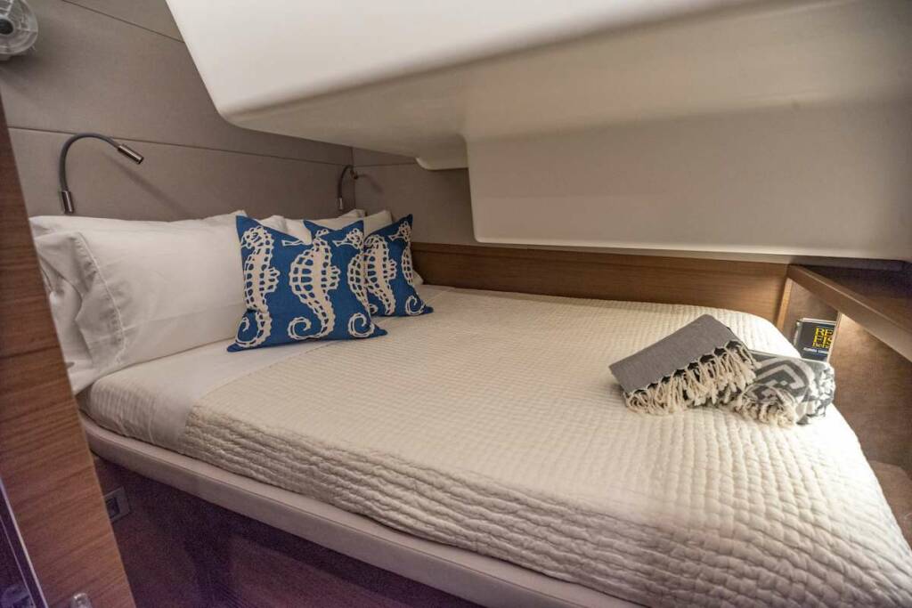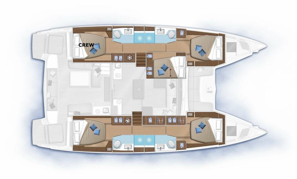 3 queen ensuite cabins and midship cabin are available to guests. Midship and port forward cabins share head. Crew will take port aft queen cabin.