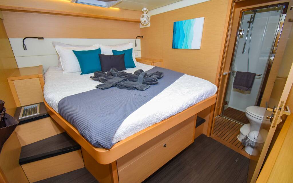 Accommodation: 3 queen cabins, private en-suite bath (electric head, wash basin and large stall shower), lots of storage and separate access directly to the aft deck.