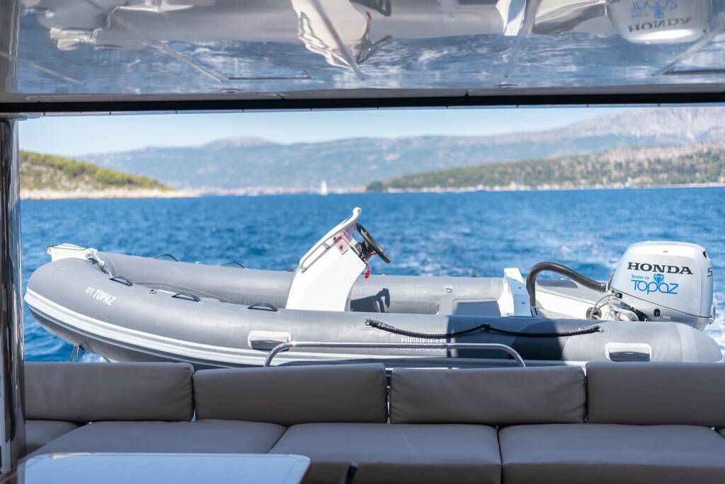 • 2 crew members (CAPTAIN & STEWARDESS), Daily preparation of 2 meals: breakfast and SIMPLE lunch • Coffee machine • Portable Bluetooth speaker JBL Xtreme 2 GM • Water toys & equipment: DINGHY SET OCEAN MASTER DELUXE 420 GREY WITH HONDA ENGINE BF50HP, 2x Stand Up Paddle boards, snorkeling equipment, inflatable water beds • 13% VAT