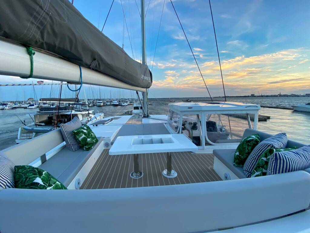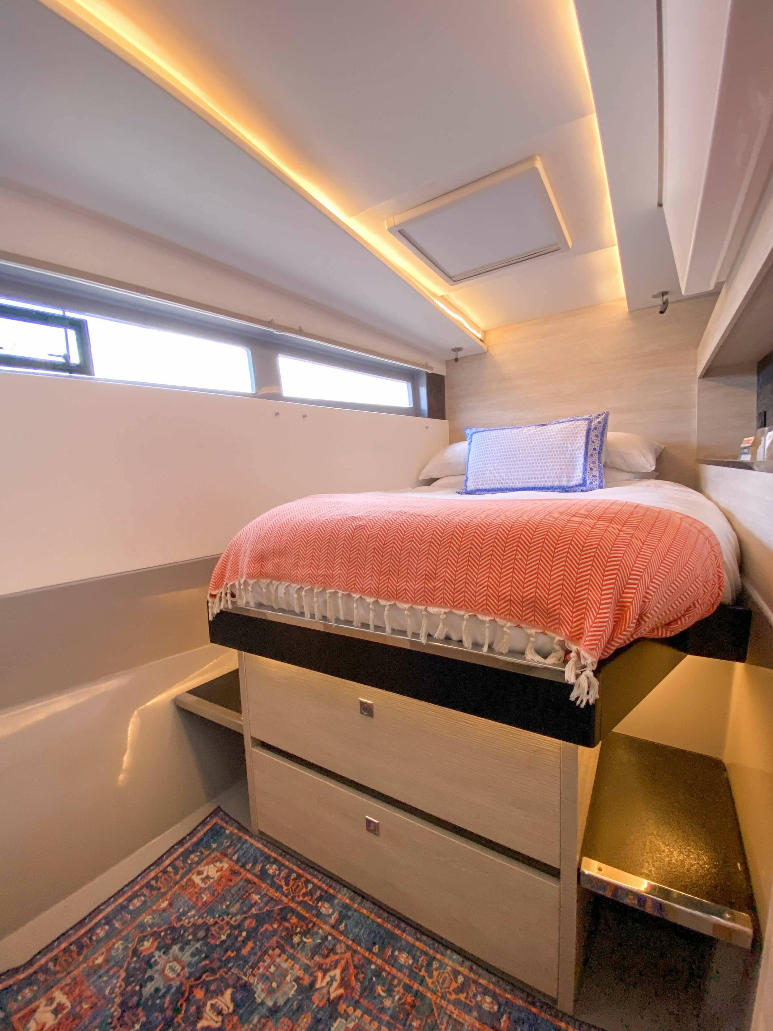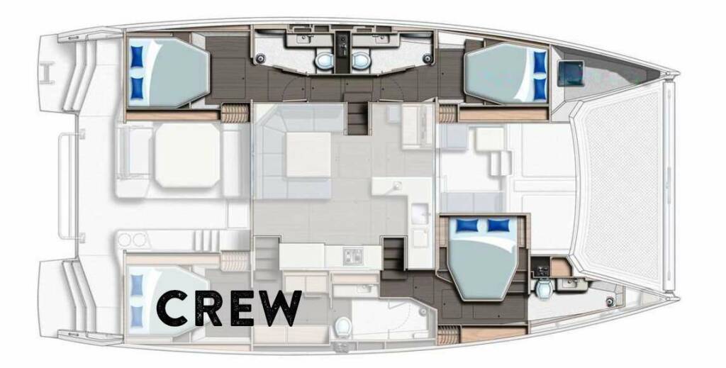 Accommodation: Southern Charm features 4 different social gathering areas which include the forward cockpit seating area, the Sky lounge the aft cockpit and salon area. Guests will enjoy the ability to sit with friends, family and guests in an area that accommodates 12 people at a time or a cozy 3-4 people for a more private setting. All cabins feature oversized queen beds with added comfort topper with high quality linen sheets. Each cabin has its own private head, bathroom with toilet (head), sink and walk-in shower with platseak comfort, non-slip flooring. Cabins also include a closet and drawers for storage.