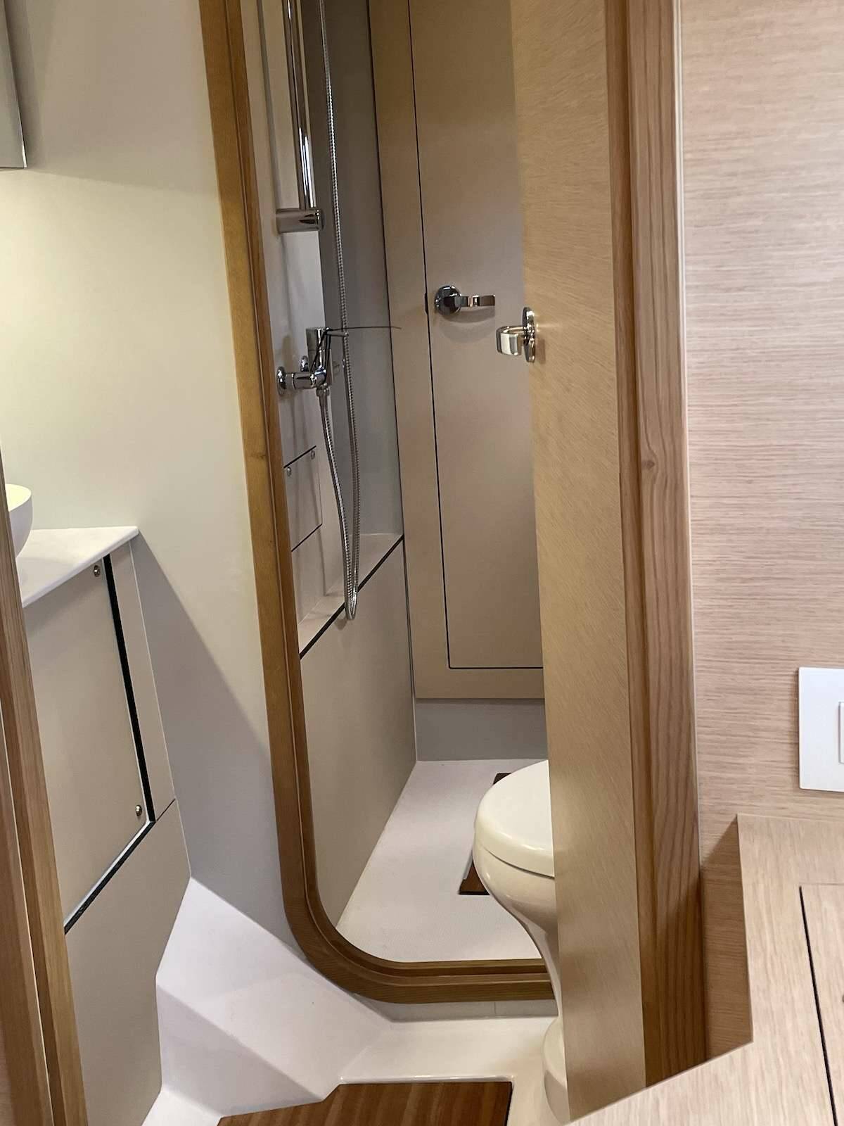 Two double cabins are in the port hull with a shared Jack 'n Jill bathroom. This is a wet head.