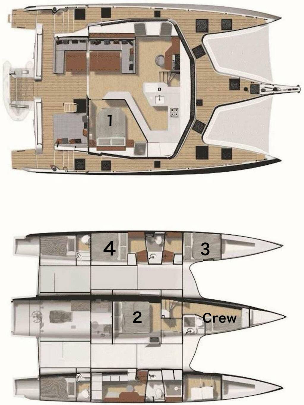 The crew occupy the bunk room which is forward in the middle hull. The crew share the bathroom with the midships queen cabin and have their own door to the bathroom.