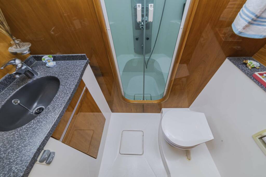 Accommodation: Two queen beds (2m x 1.6m) with ensuite dry heads forward, two king beds with ensuite dry heads aft. There is an additional queen bed centre of the yacht with an ensuite wet heads used by the crew.