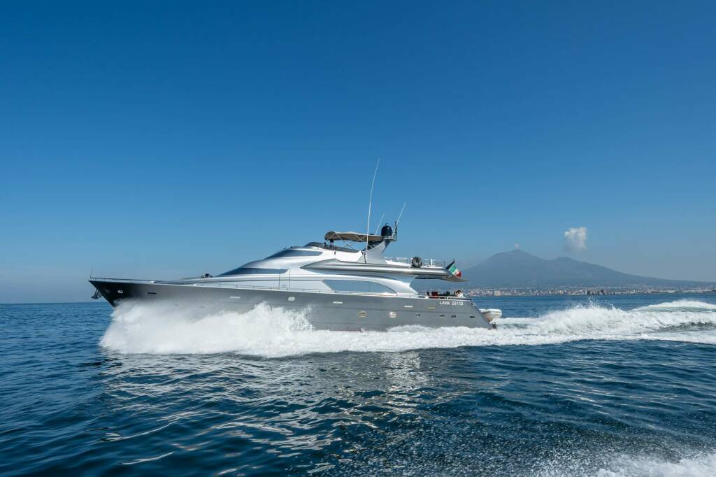 Luxus-Motoryacht LADY B, Baujahr 2007 liegt in W. Med -Naples/Sicily, W. Med -Riviera/Cors/Sard. vor Anker. Sie hat 4 Kabinen, bietet Platz für 8 Personen.