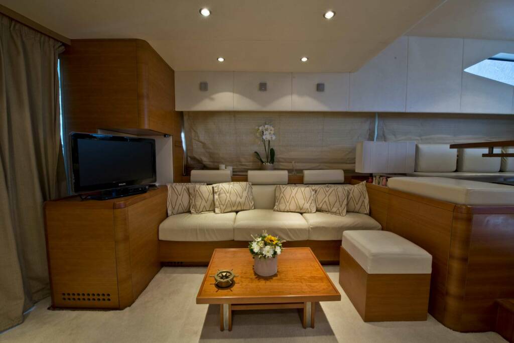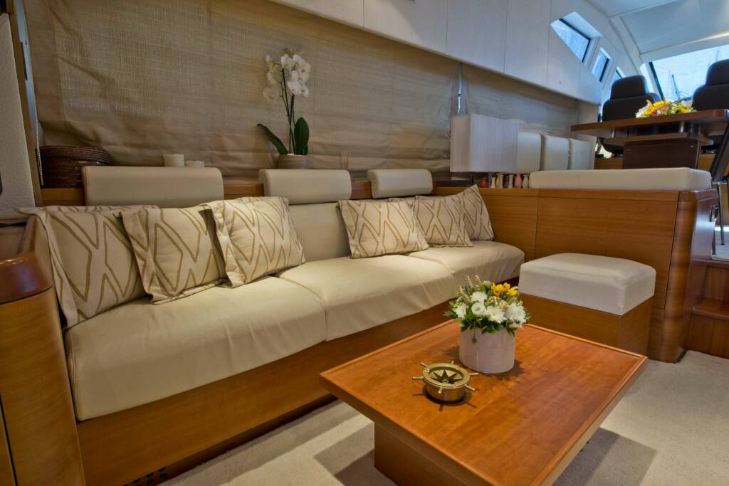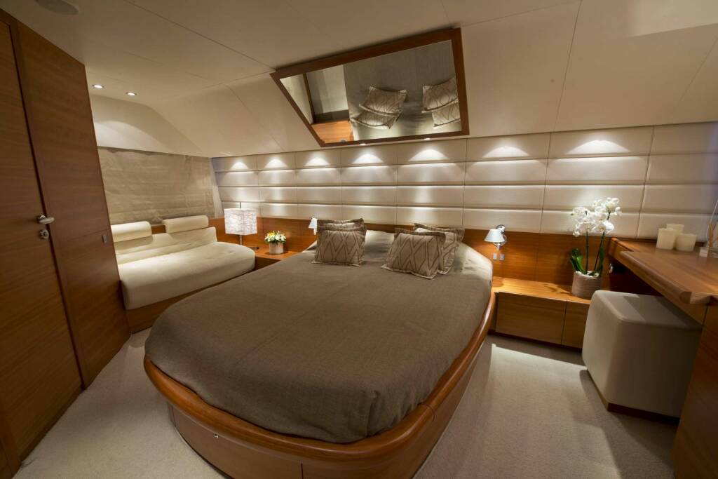 Accommodation: The Master cabin is amidships and full beam of the yacht, with a center lined queen size bed, sofa, vanity, walk in wardrobe and en-suite facilities.