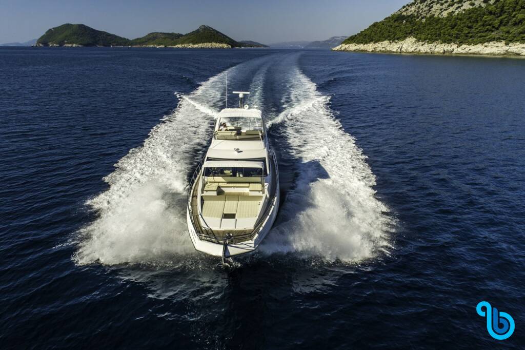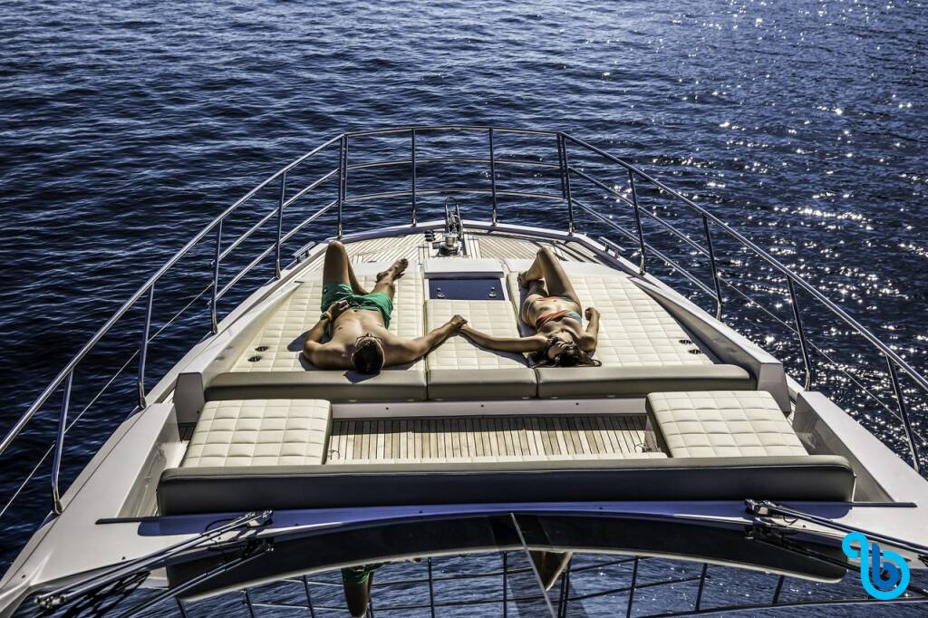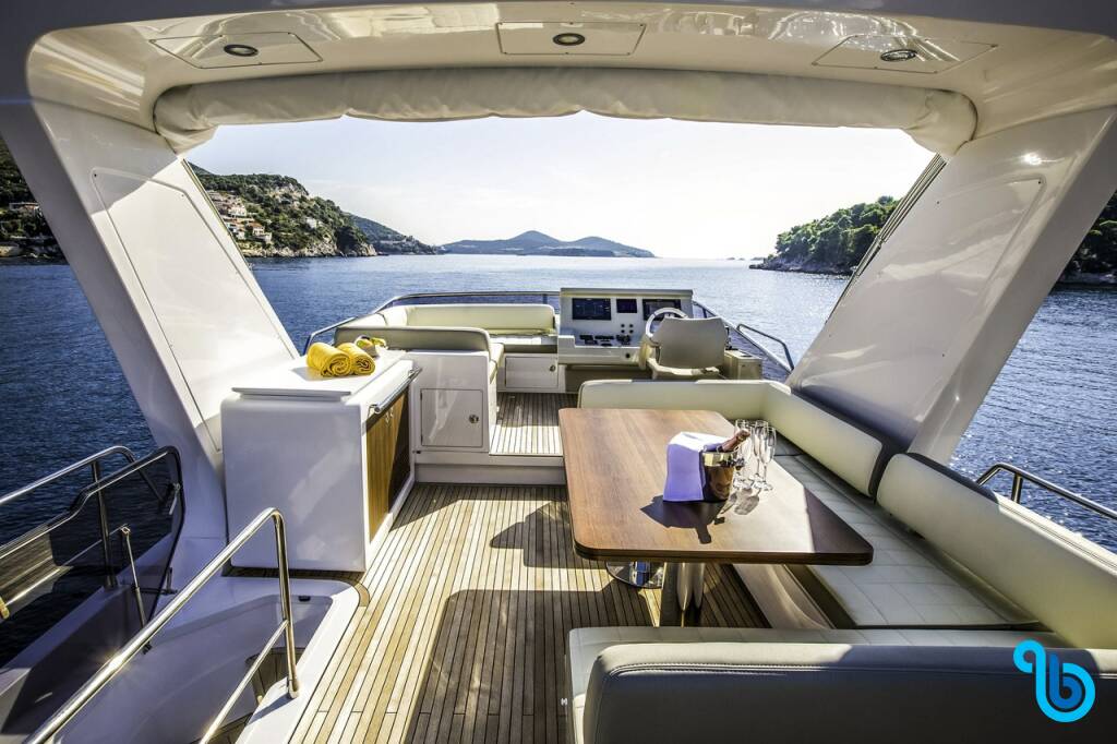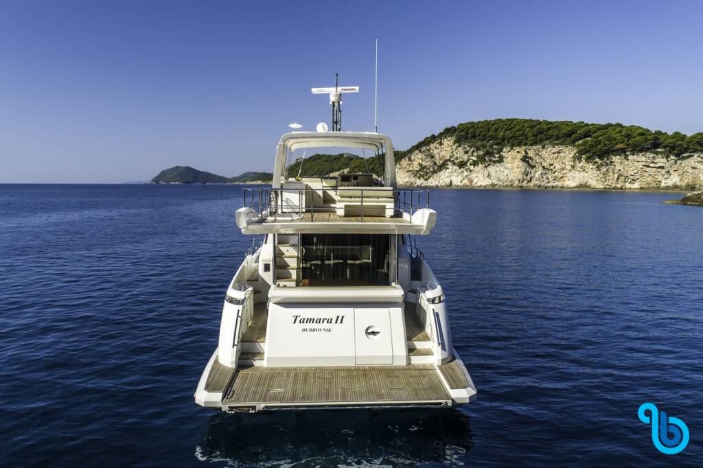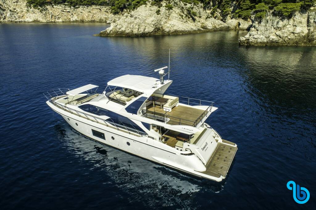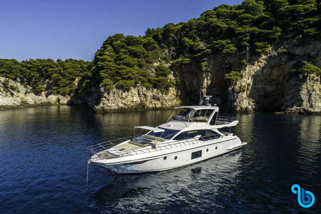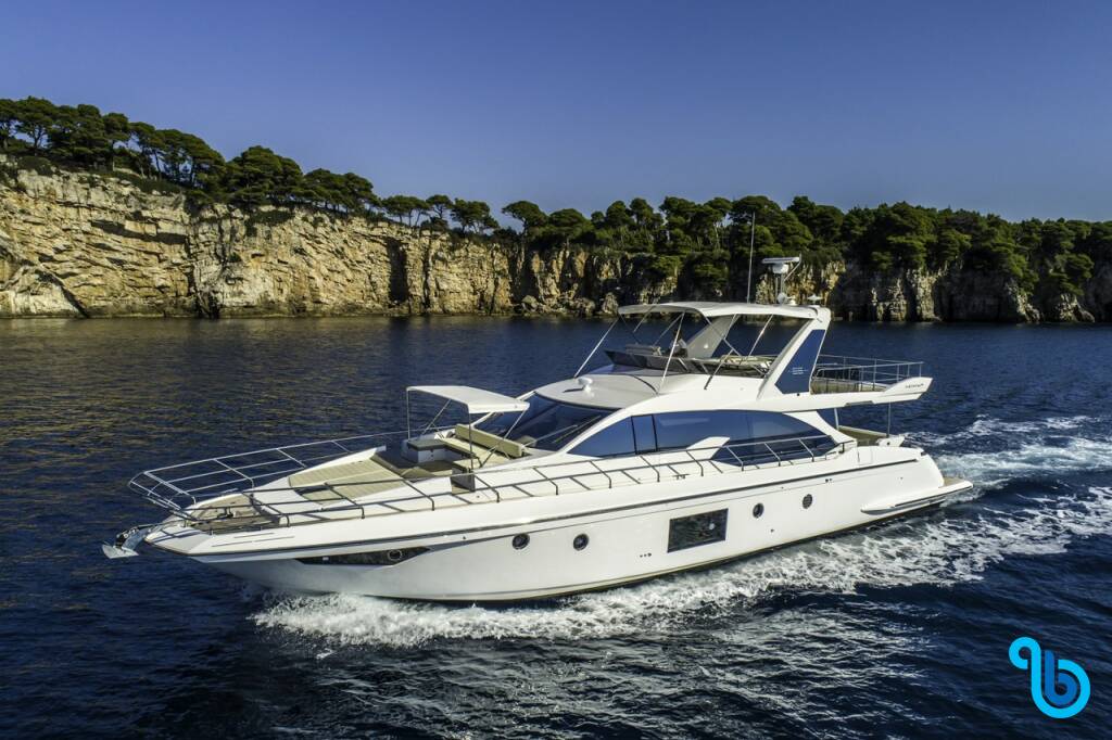 Luxus-Motoryacht Azimut 66 Tamara II, Baujahr 2018 liegt in Kroatien vor Anker. Sie hat 4 Kabinen, bietet Platz für 8 Personen.