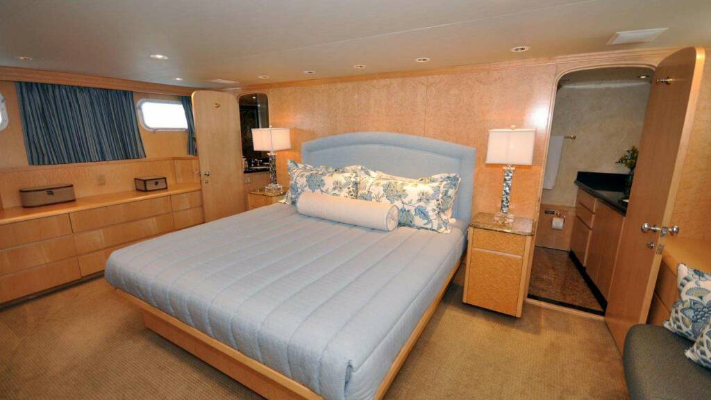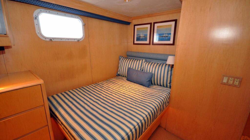 Accommodation: LUCKY STARS accommodates 8 guests in 4 staterooms. VIP Queen forward stateroom with en suite bath, King Master stateroom with His and Hers bath, Queen guest stateroom and one twin stateroom both with en suite baths.