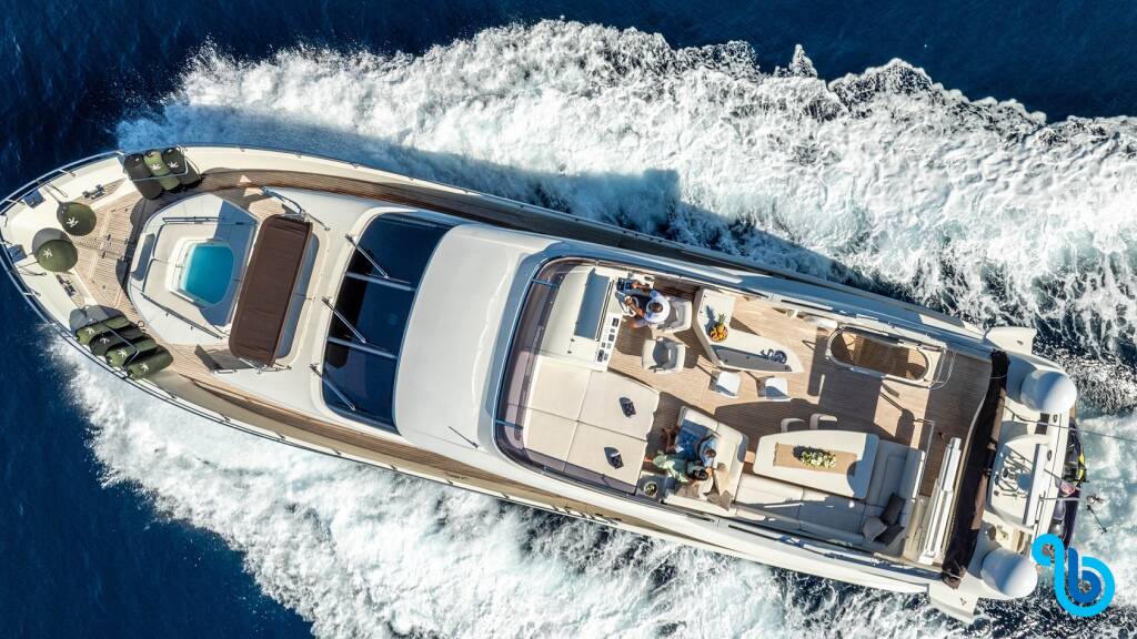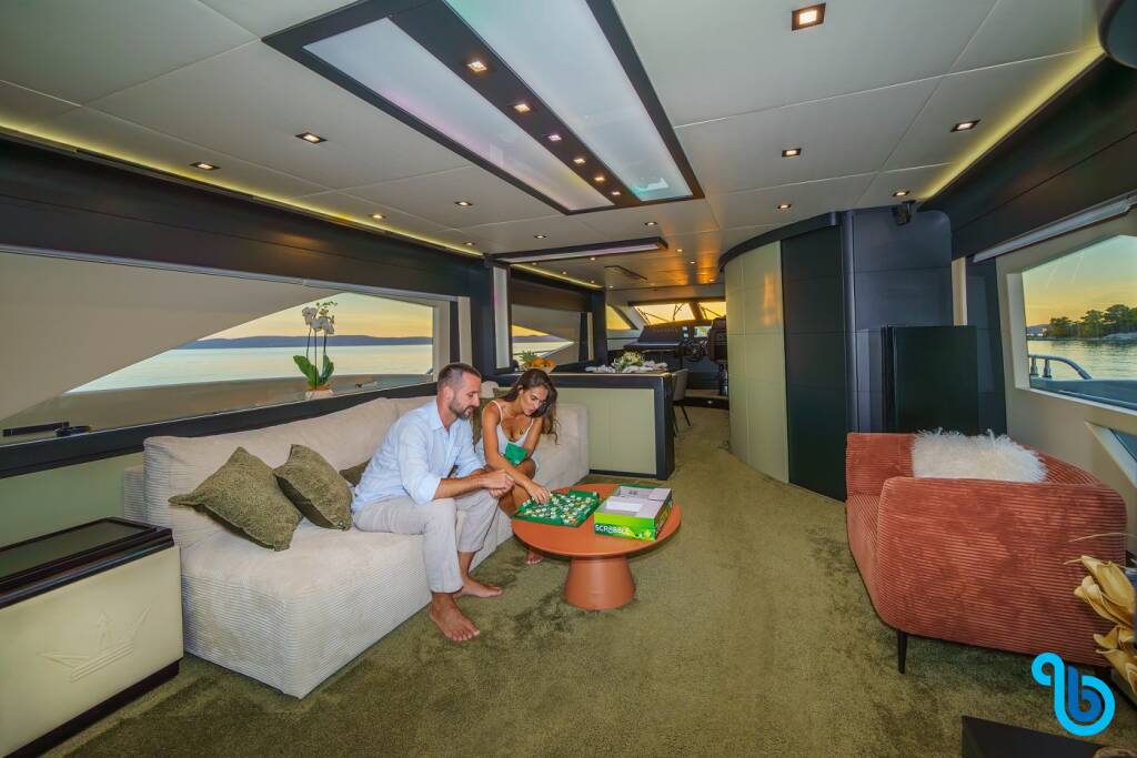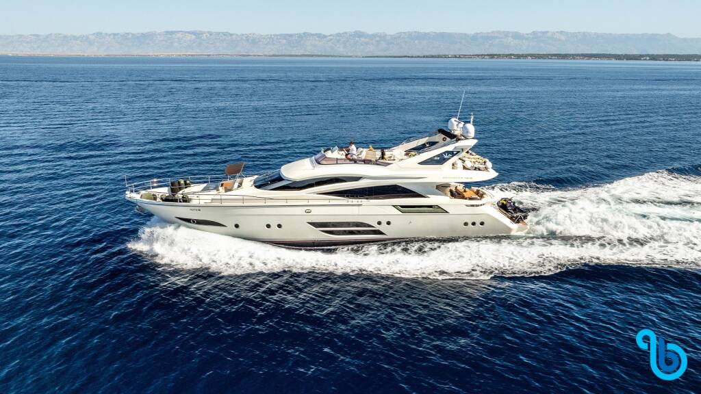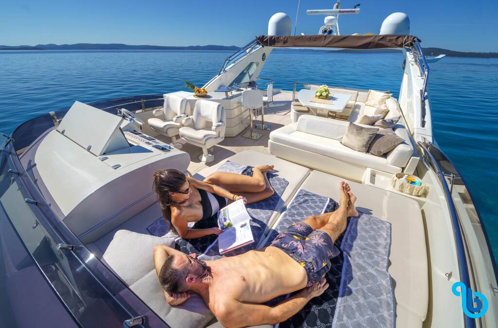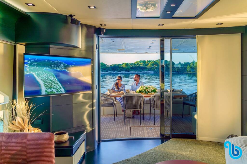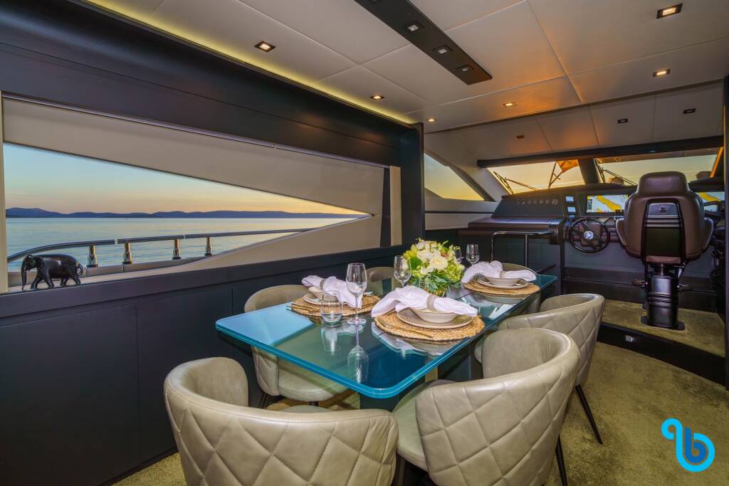 Luxus-Motoryacht Dominator 780S Deluxe Dalia, Baujahr 2009 liegt in Kroatien vor Anker. Sie hat 4 Kabinen, bietet Platz für 8 Personen.