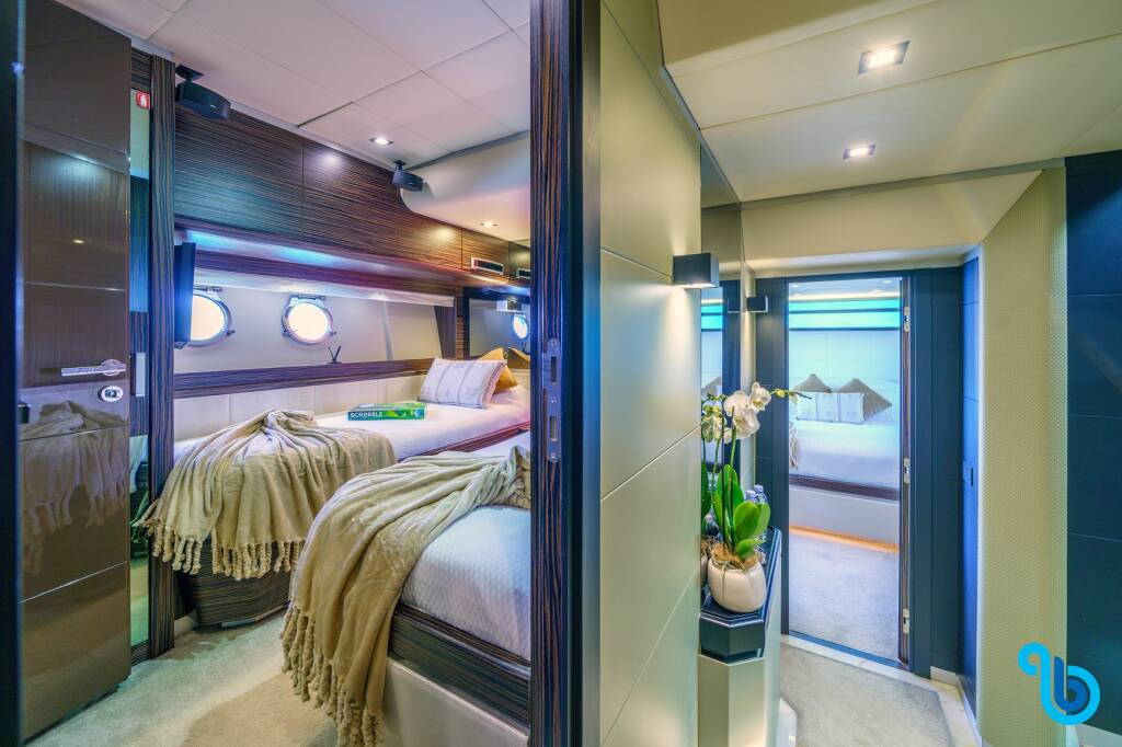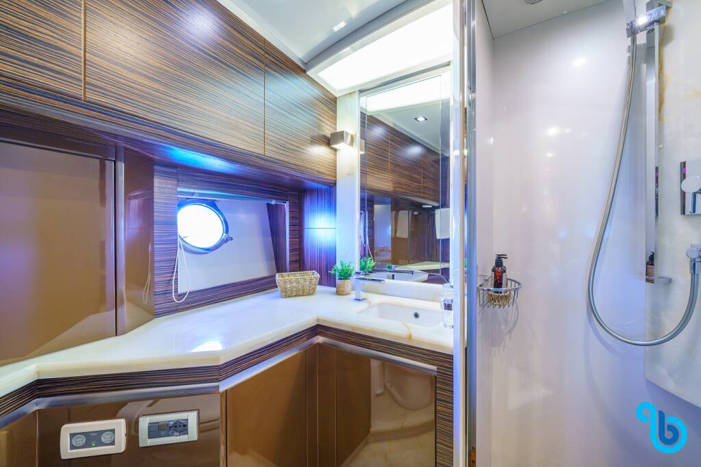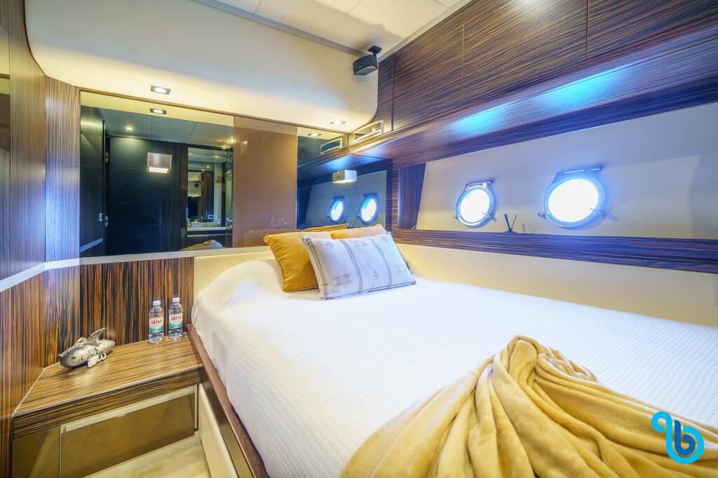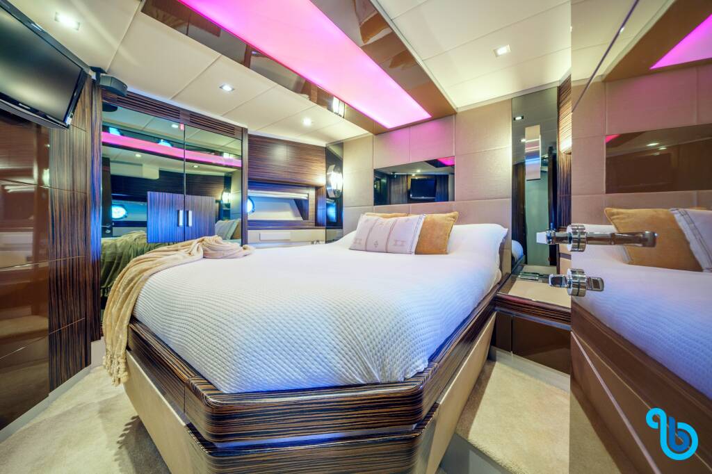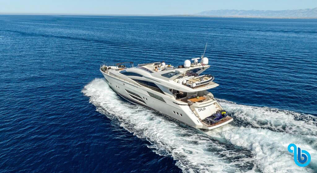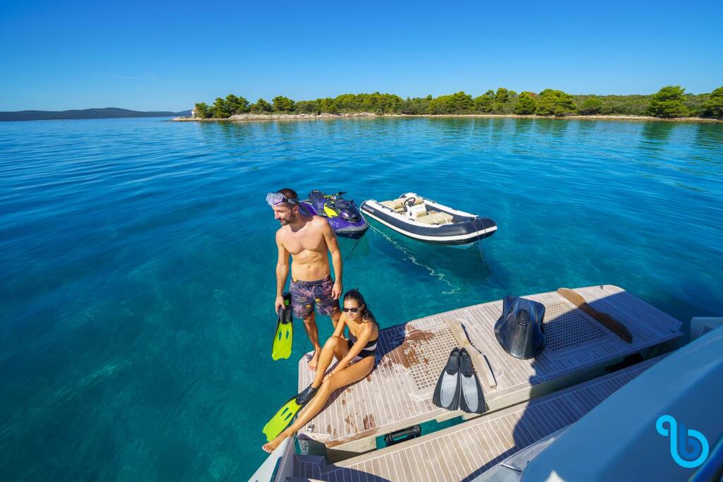 Luxus-Motoryacht Dominator 780S Deluxe Dalia, Baujahr 2009 liegt in Kroatien vor Anker. Sie hat 4 Kabinen, bietet Platz für 8 Personen.