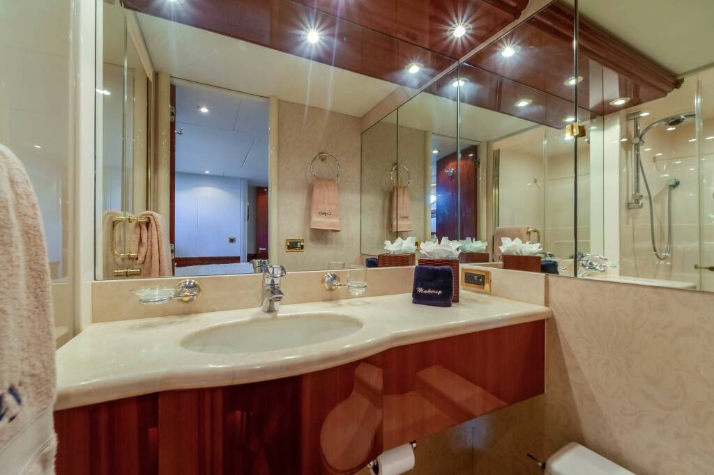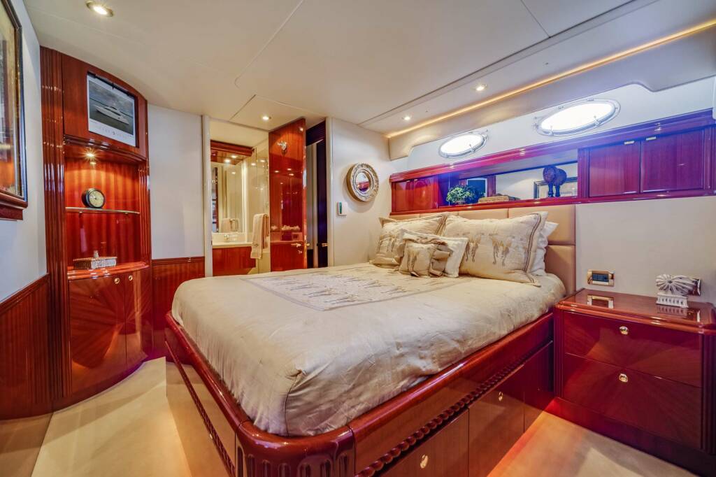 Accommodation: The overnight accommodation sleeps a total of 6 guests over 3 en-suite cabins: 1 Master suite, 2 double cabins. ~ The Master suite is situated amidships on the lower deck to make use of the full beam. Within, there is a king-sized bed with a widescreen TV opposite, a sofa against a one wall and a desk/vanity along the other, plenty of storage and an en-suite bathroom with two sinks, a toilet and a bathtub with showerhead. ~ The double cabins on the lower deck both have a queen-sized bed with a widescreen TV opposite, plenty of storage and an en-suite bathroom with a sink, toilet and shower. ~ The professional crew of 3 will ensure that every guest has fast and discreet service throughout their stay.