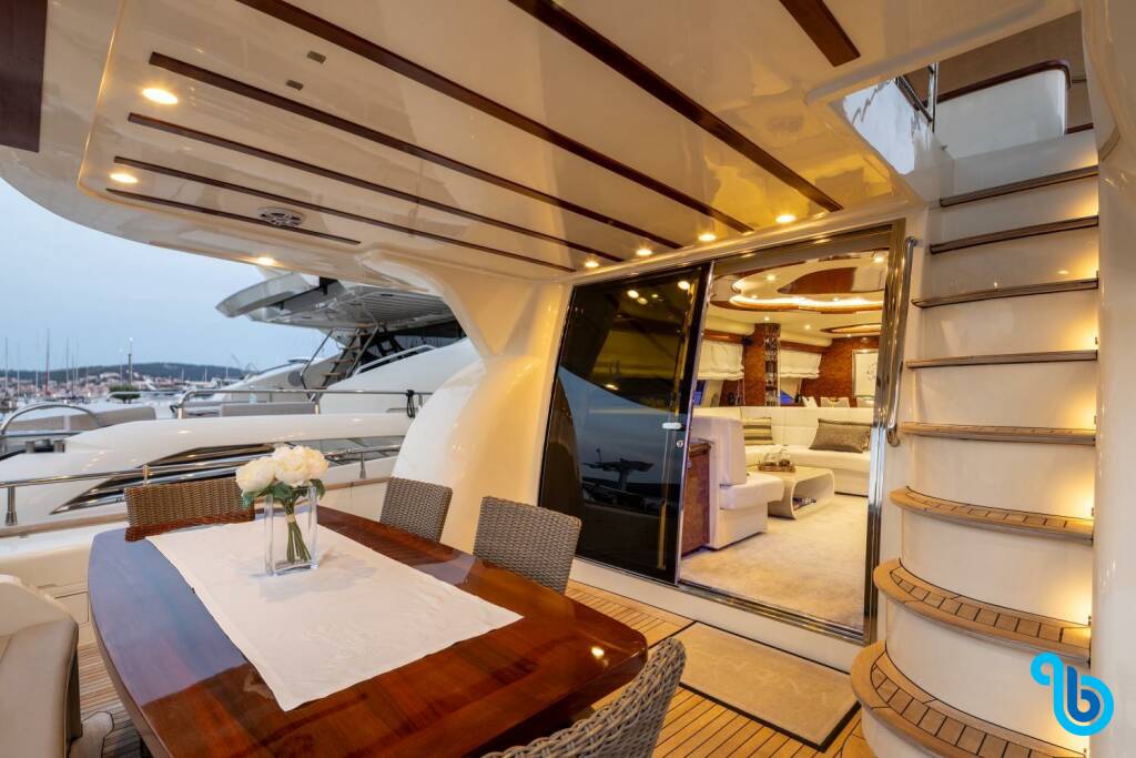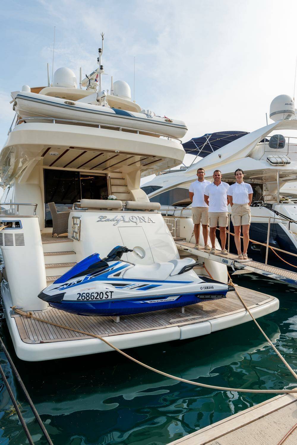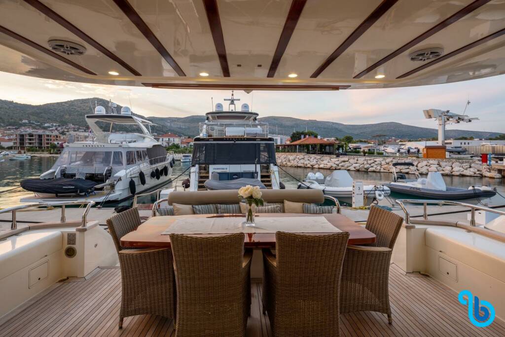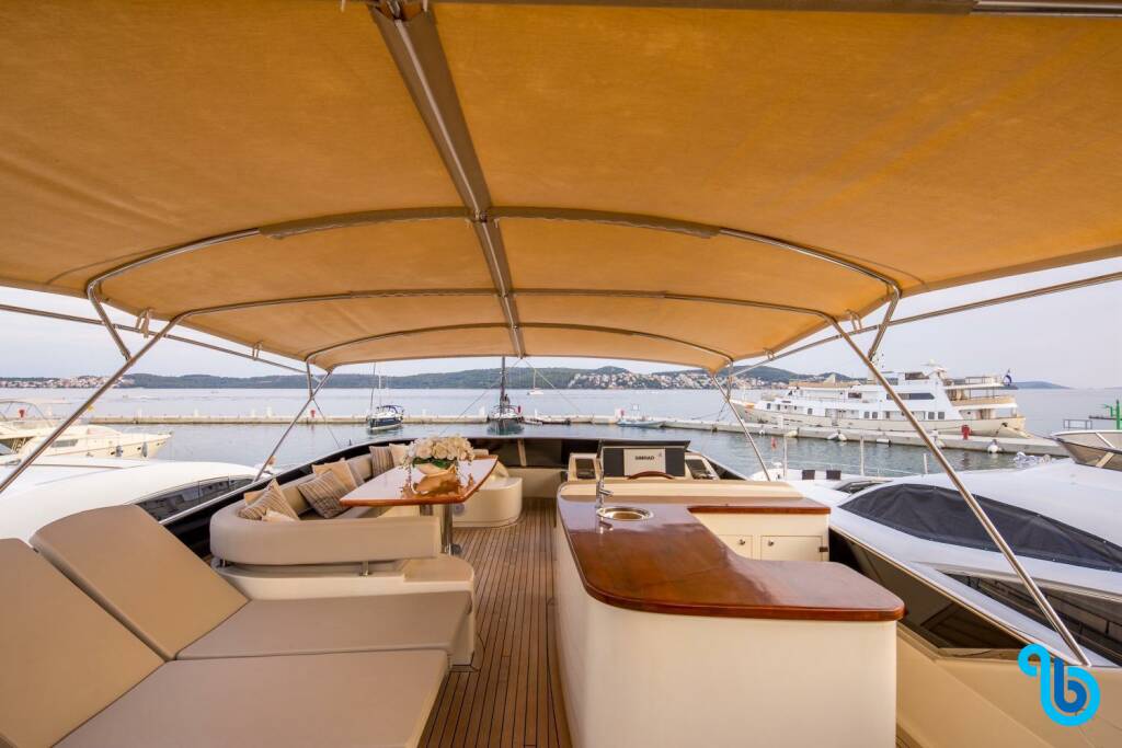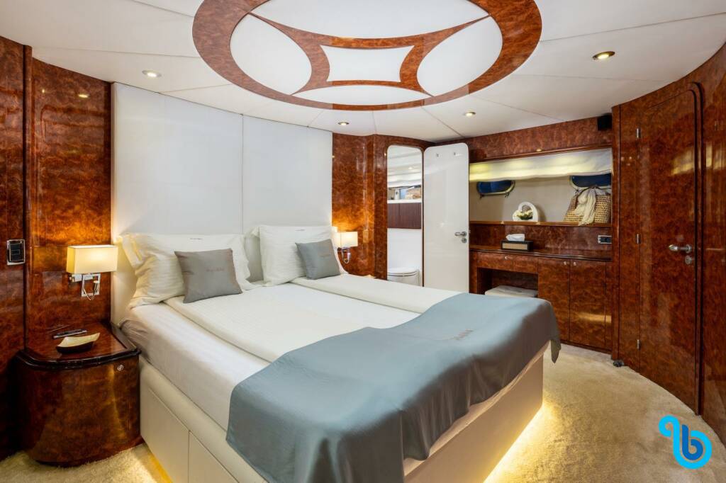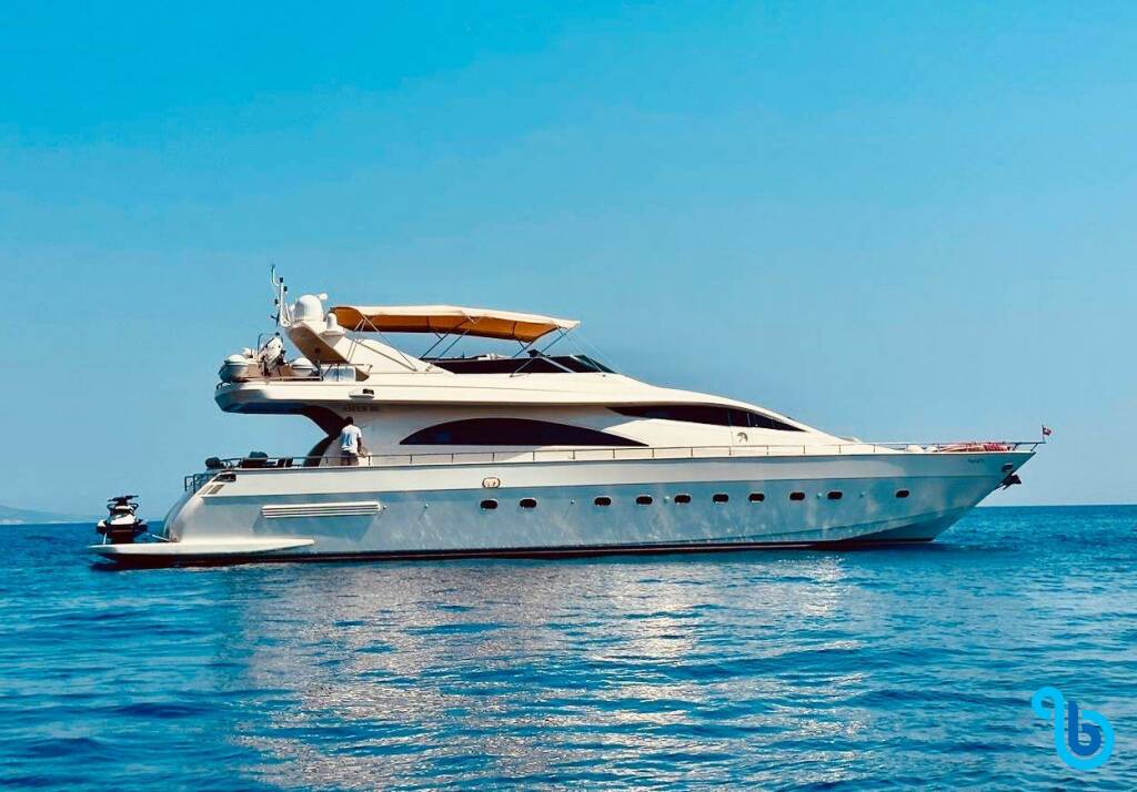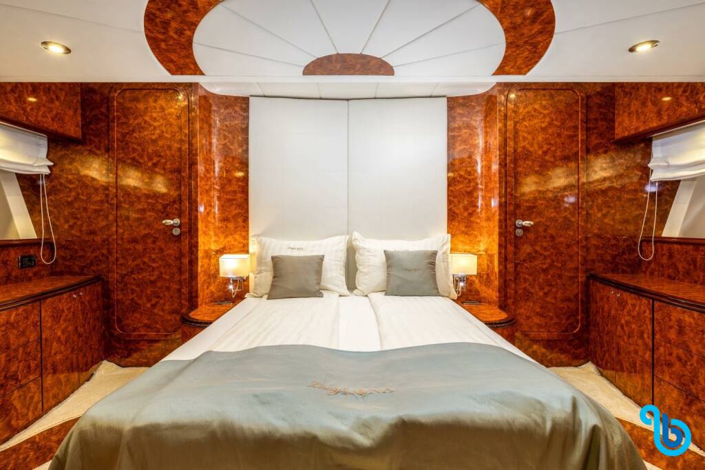 Luxus-Motoryacht Amer 86 Lady Lona, Baujahr 2003 liegt in Kroatien vor Anker. Sie hat 4 Kabinen, bietet Platz für 8 Personen.