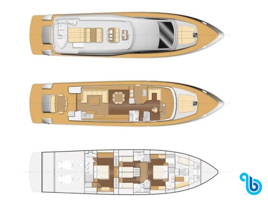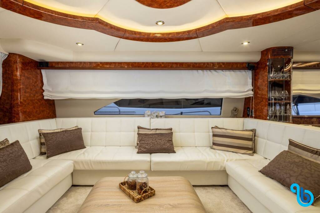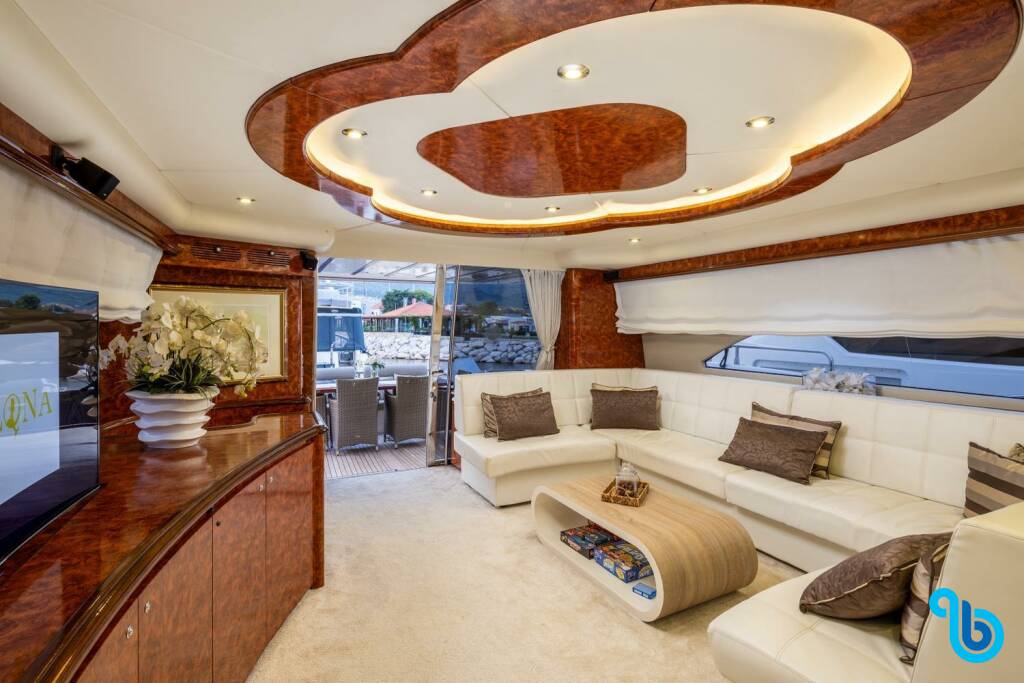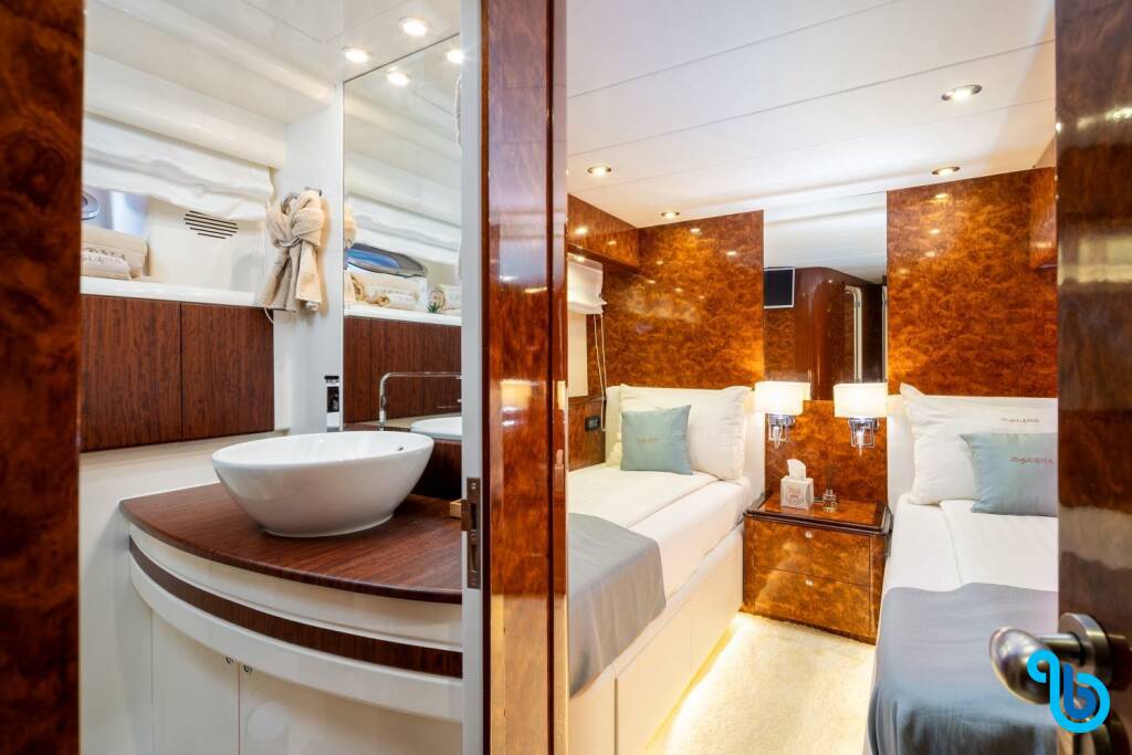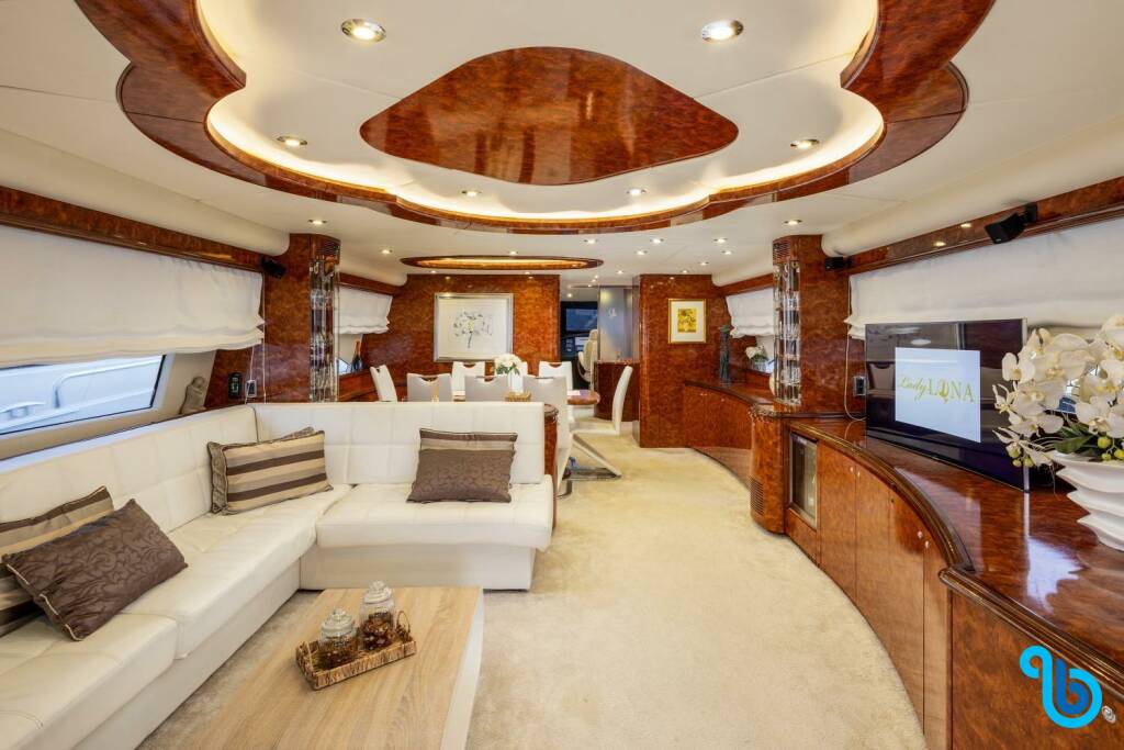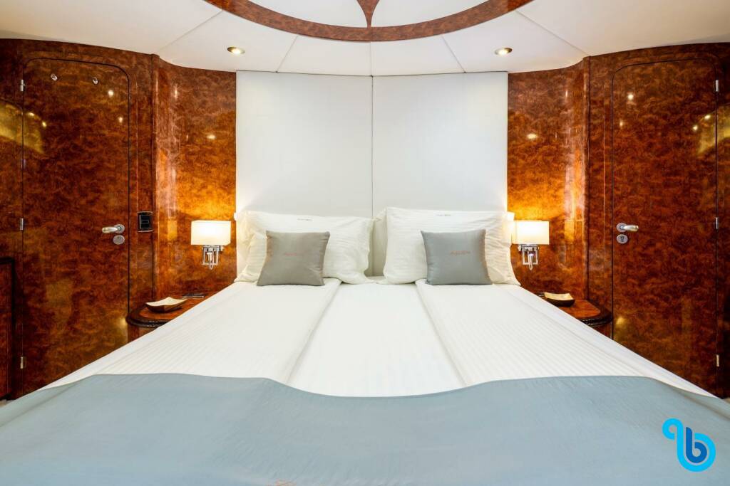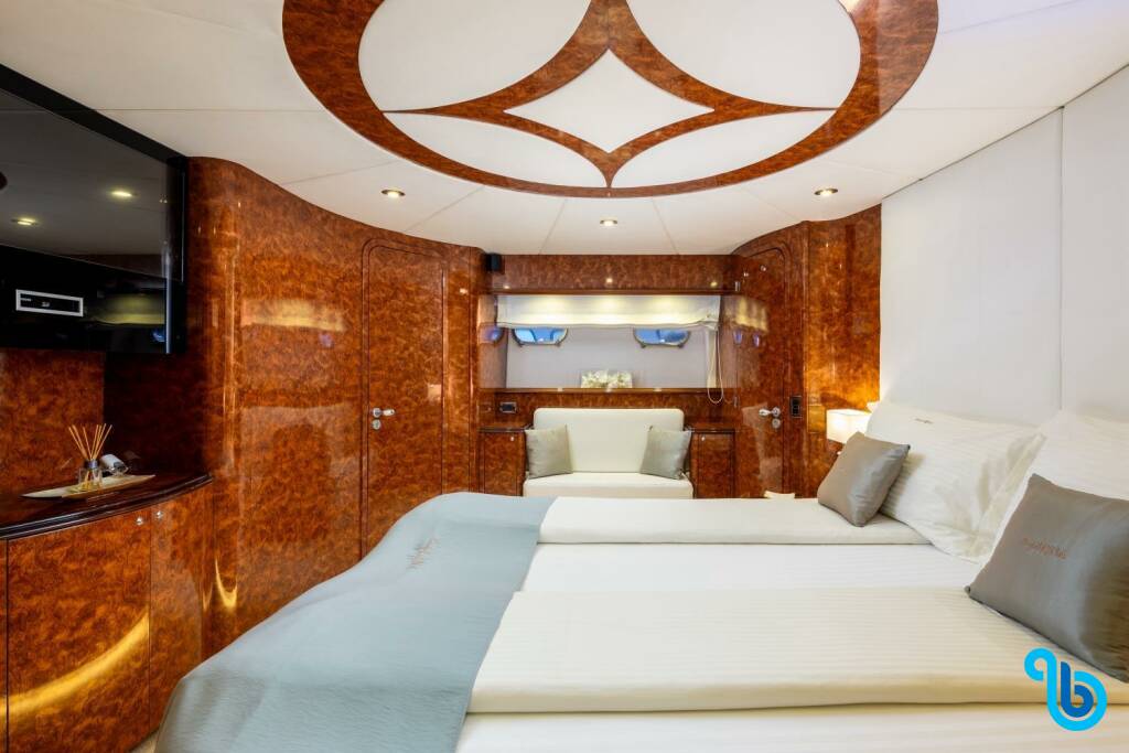 Luxus-Motoryacht Amer 86 Lady Lona, Baujahr 2003 liegt in Kroatien vor Anker. Sie hat 4 Kabinen, bietet Platz für 8 Personen.