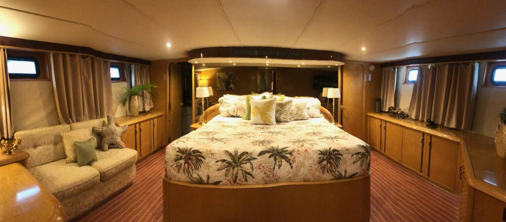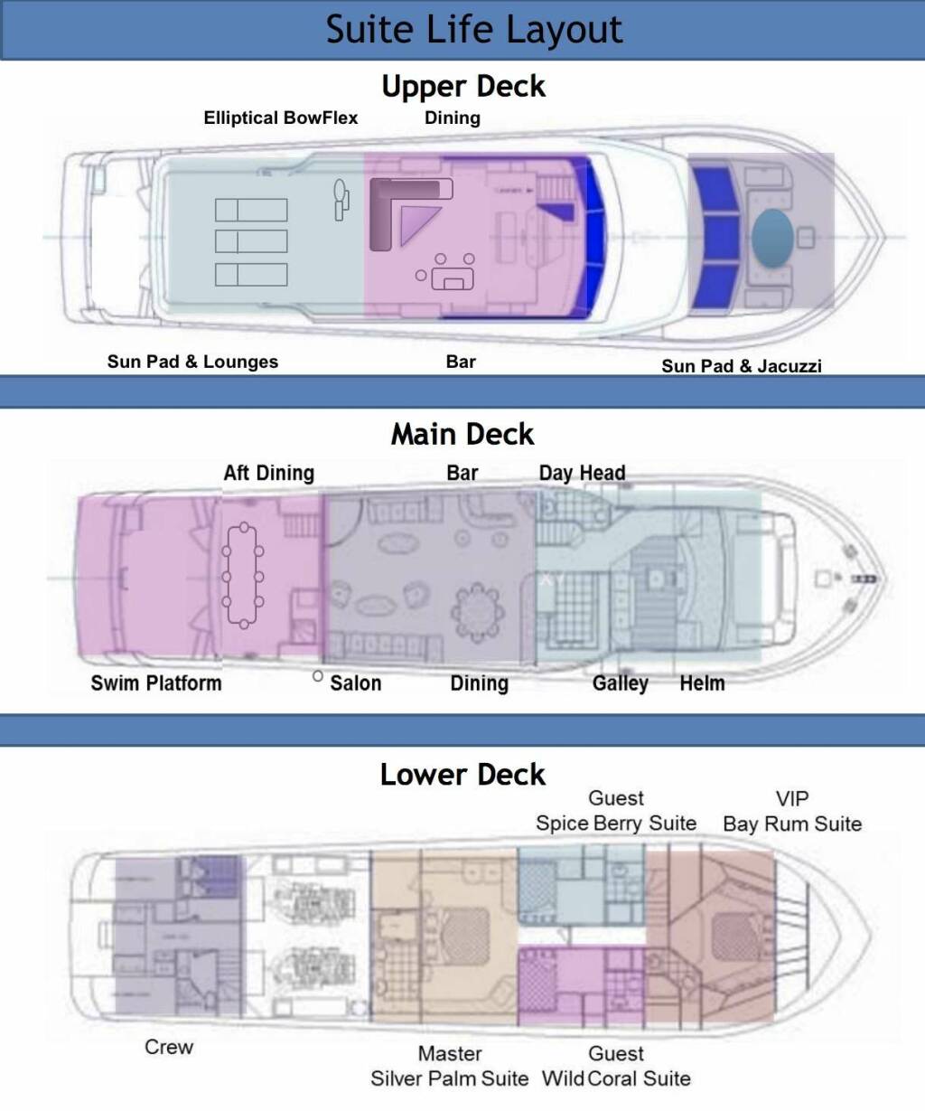 Suite Life’s luxury staterooms are all appointed with percale sheets, Egyptian cotton towels and robes to provide ultra comfort during guests private yacht charter. The Master Silver Palm Suite has a King bed, walk-in closet, security box, vanity table, sofa and master bathroom with full jacuzzi.The VIP Bay Rum Suite has a walk-around queen and walk-in closet. The port side Spice Berry Suite guest stateroom has a queen bed and large closet. The starboard Wild Coral Suite guest stateroom has a full bed and twin.
