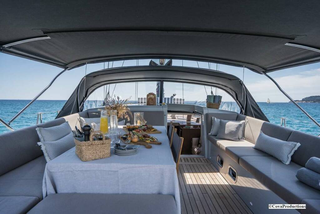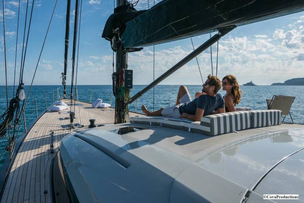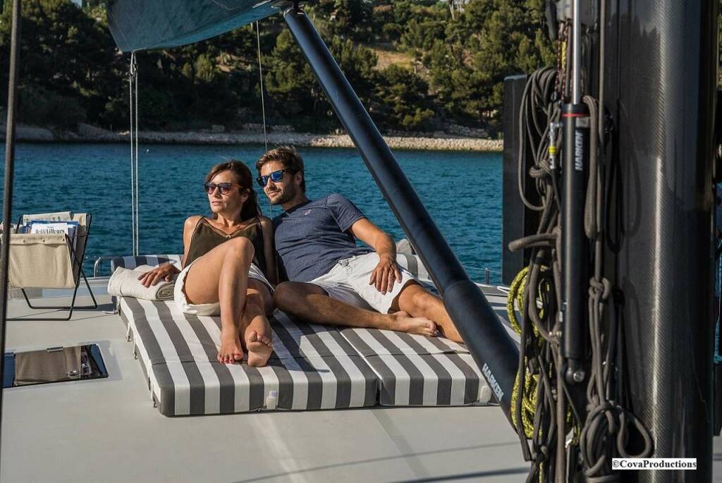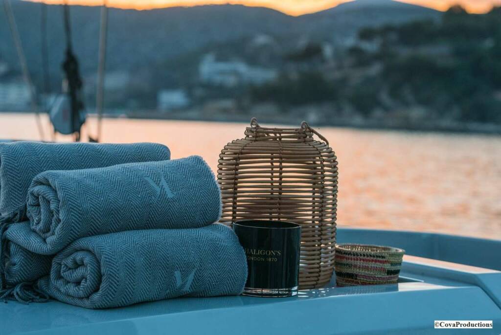 Deck shower and swim platform, bimini and sun awning, sun bathing cushions, beach towels.