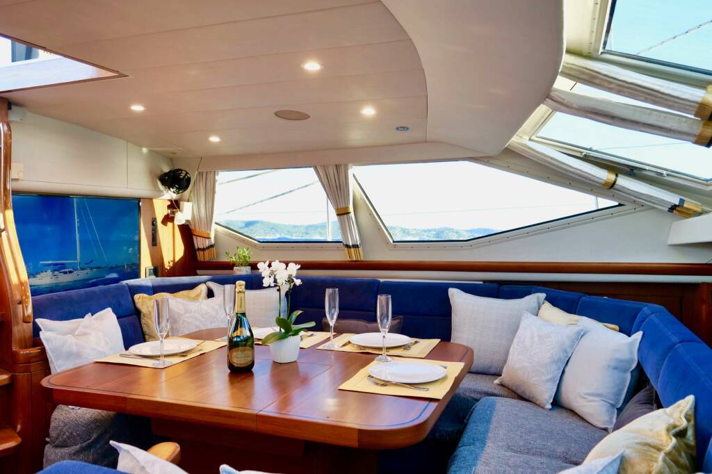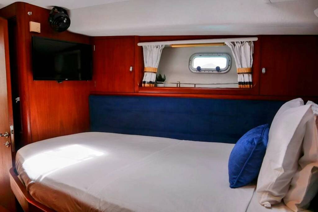 Accommodation: Elvis Magic has 3 guest cabins and boasts a spacious primary aft cabin with a king size bed and en-suite, which also has a private deck and entrance aft. This cabin has a small reading seat and a 20 inch flat screen TV. There is a double cabin in the starboard forward with a raised full-size bed, also with en-suite, along with a 20 inch flat screen TV.