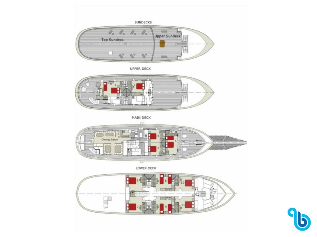 • Catamaran for generous spaces, superior stability, and enhanced privacy.