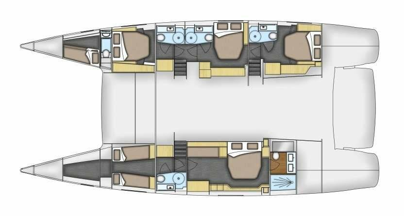 Accommodation: 1 x Master cabin, 3 double queen berth cabins