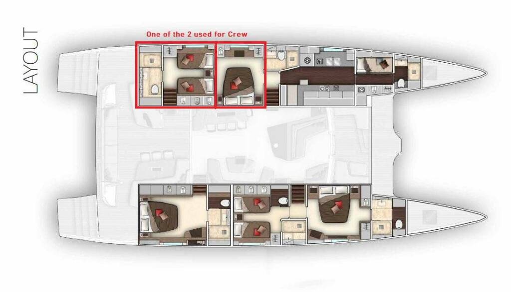 Luxury catamaran CAT TUA, built in 2021 is anchored in the W. Med -Naples/Sicily, W. Med -Riviera/Cors/Sard.. It has 4 cabins, can accommodate 8 people.