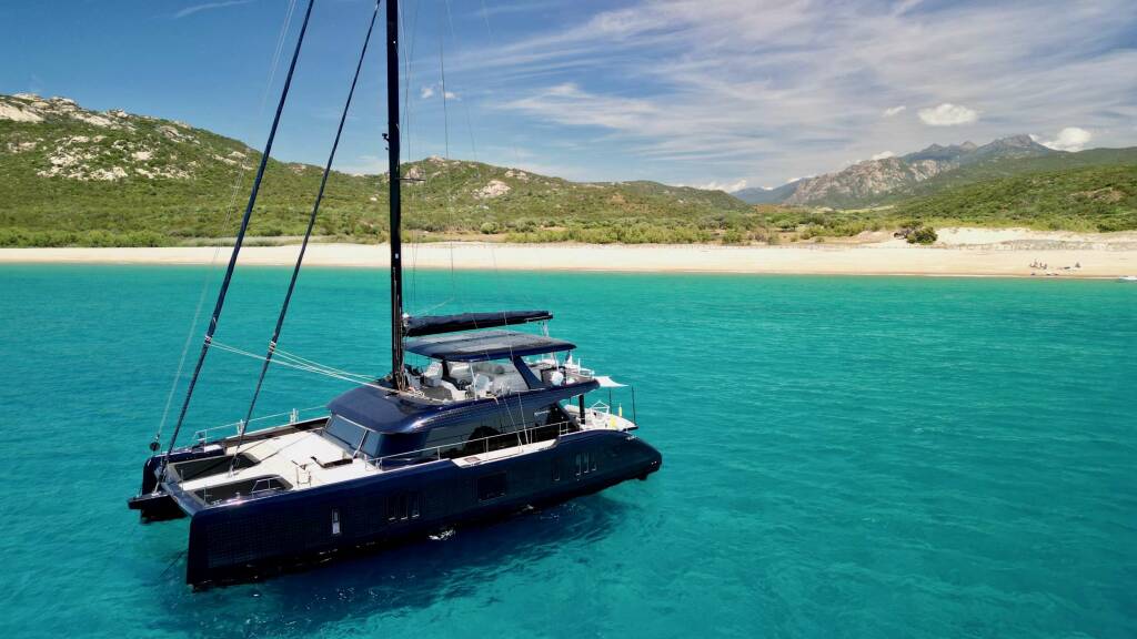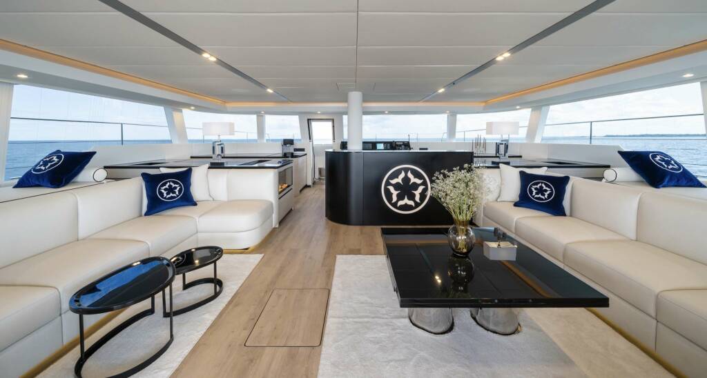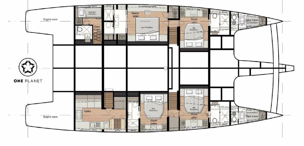 Luxury catamaran ONE PLANET, built in 2023 is anchored in the W. Med -Naples/Sicily, W. Med -Riviera/Cors/Sard.. It has 4 cabins, can accommodate 8 people.