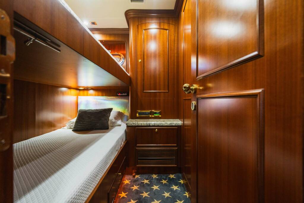 Accommodation: LEXINGTON features four staterooms each with en-suites, including his and hers baths in the master, which offers a king bed, while the VIP + starboard guest cabins have queen berths, and the port guest cabin has bunk-style twins. The main salon is outfitted with a large, brand-new sofa, pop-up TV and bar. Forward of the salon is the formal dining area that can seat up to eight guests. Moving forward, you'll find a wrap-around galley that includes a country-style dinette. The bridge + sky lounge is extended and features a day-head, bar and flat-screen TV, as well as a spacious seating area and grill on her aft deck.