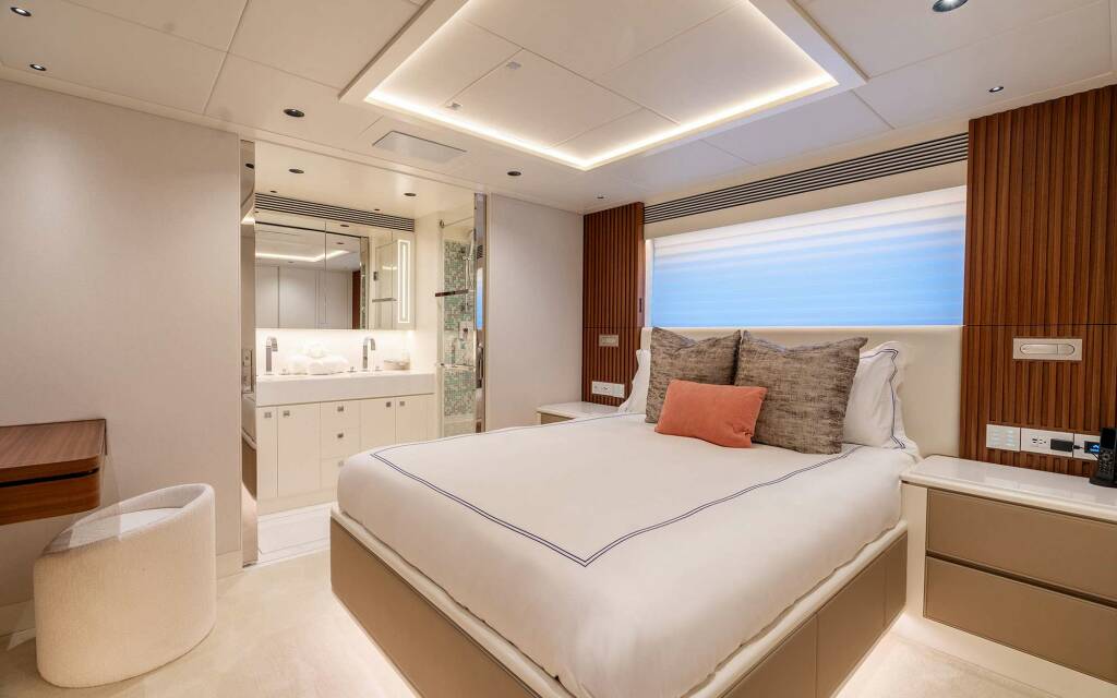 Accommodation: Large Owner suite with King bed is positioned forward facing on the main deck with full length bathroom featuring double sinks, shower, private toilet enclosure and ample hanging and drawer storage.