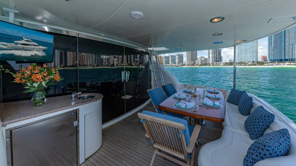 FLYBRIDGE bar with 3 bar stools, fridge, icemaker, blender