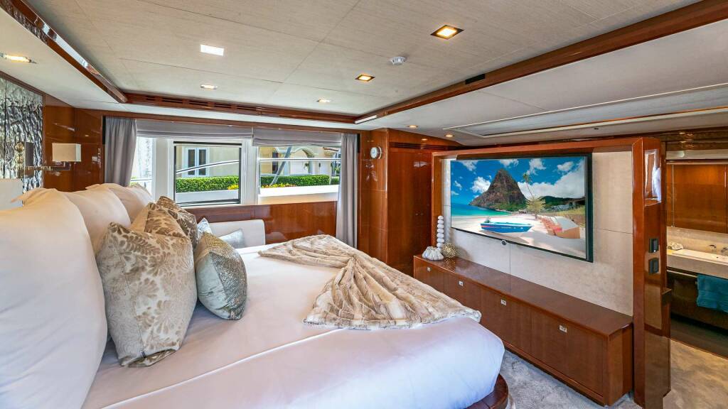 Occupying a prime position forward on the main deck, the full-beam master suite is a sanctuary of light and space. Expansive panoramic windows frame sweeping ocean views, while a king-size bed, vanity desk, and ample wardrobe storage ensure complete comfort. The en-suite bathroom is finished in marble, with dual sinks, a walk-in rain shower, and a separate bathtub, creating a serene retreat for the principal guests.