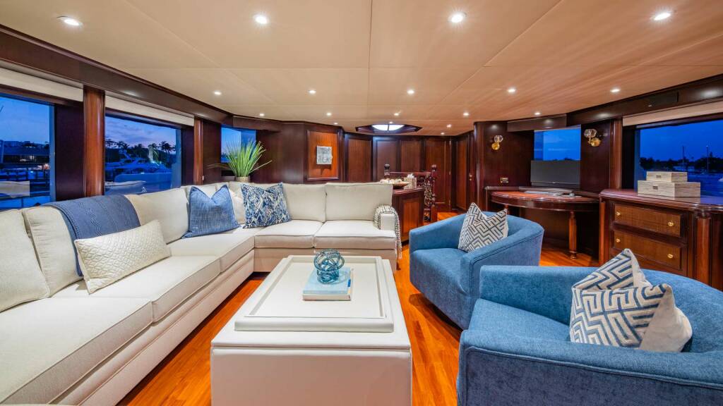 The skylounge area is a great alternative for intimate cocktails and entertaining, or simply to escape to a quieter place for a bit of work at the desk or relaxation in the cozy sofa or chairs. The Master suite is located amidship on the lower deck and features a California King size bed, full seating area with sofa and chairs, large walk-in closets with dressing area and elegant en-suite marble accented bathroom with steam shower.