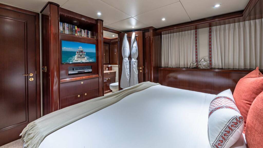 There are four additional staterooms aft of the Master including a Queen VIP with pullman and sofa bed, two mirrored guest staterooms set with King sized beds and a Twin guest stateroom to starboard. Each stateroom is ensuite with head and shower and fully equipped with flat screen TV, DVD and CD.