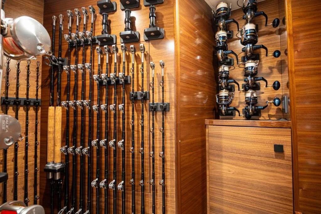 All staterooms include their own ensuite head with separate shower. The VIP stateroom forward and the guest cabin aft are both appointed with walk-around queen beds. A guest and crew stateroom are on the port side, each with upper and lower berths. The crew stateroom is immediately adjacent to the rod and tackle locker.