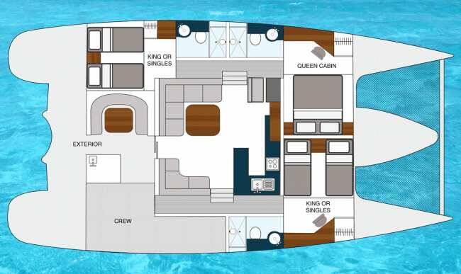 Accommodation: The Master cabin has a queen size bed. The other two cabins are convertible, to be configured either as king size beds or alternatively as twins. All cabins have en suite bathrooms, and are fully air conditioned.