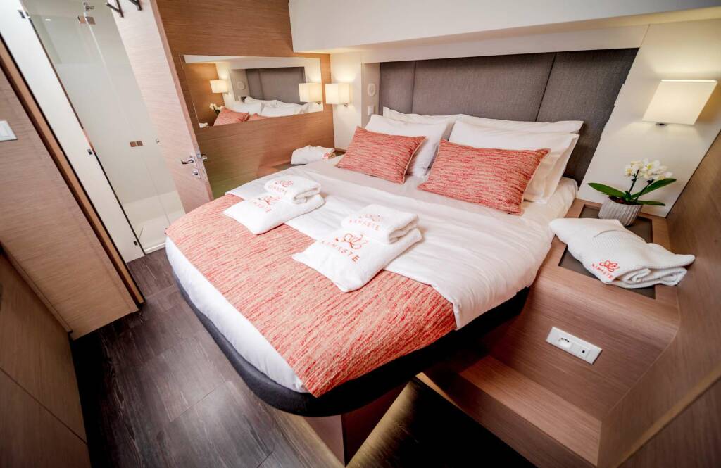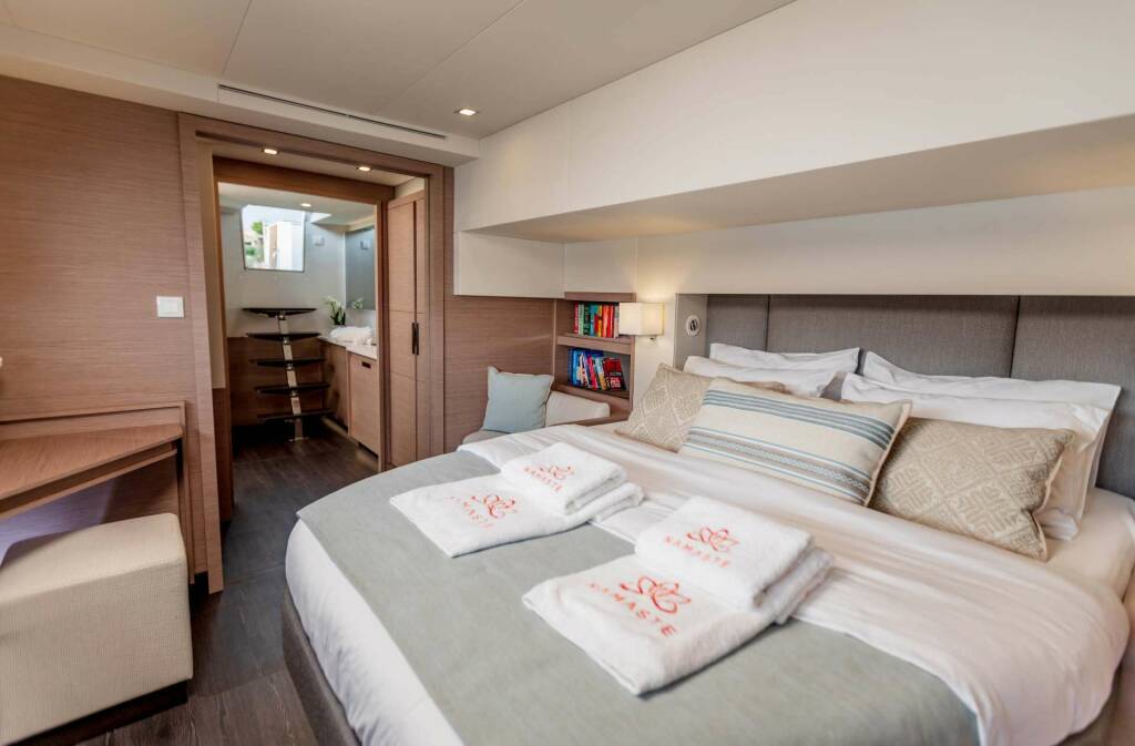 Catamarán de lujo NAMASTE (SAMANA), construido en 2021 está anclado en Greece. Tiene 4 cabinas, puede acomodar 8 personas.