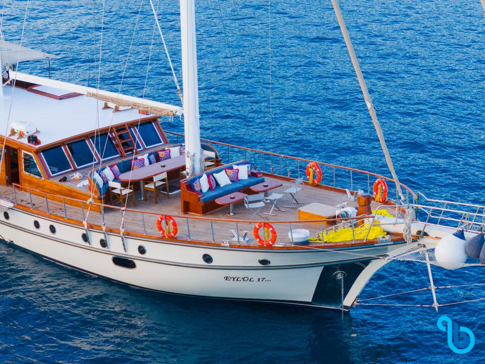 Goleta 28M GULET EYLUL 17, construido en 2005 está anclado en Turquía. Tiene 5 cabinas, puede acomodar 10 personas.