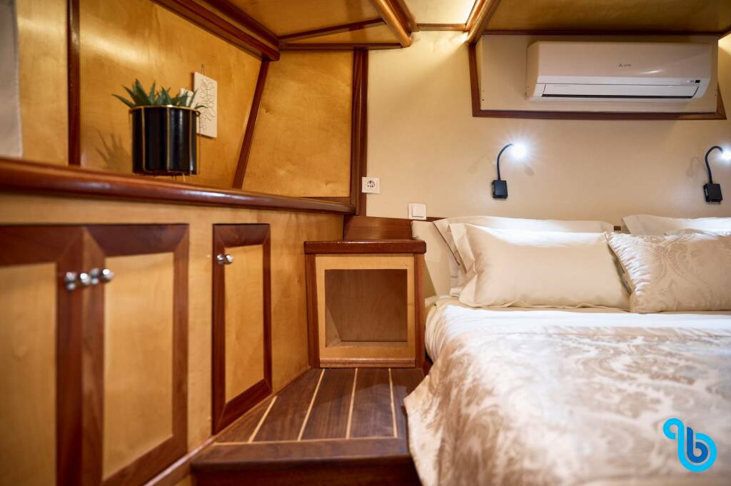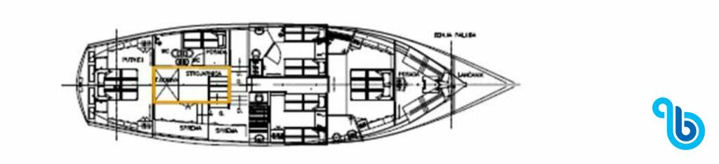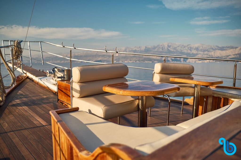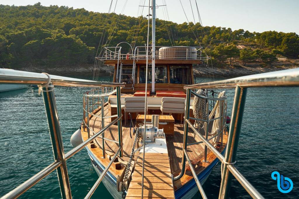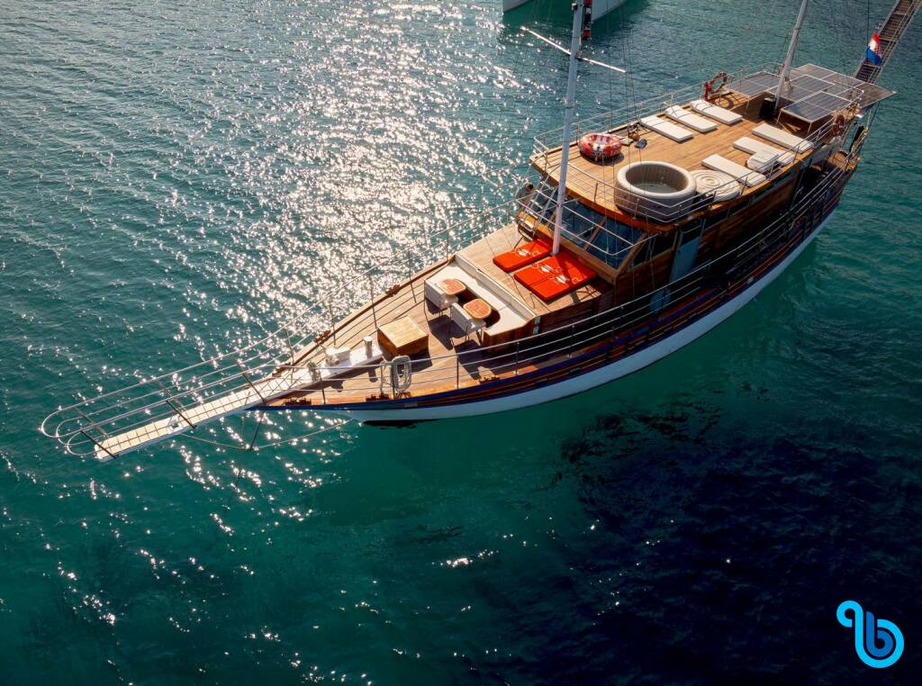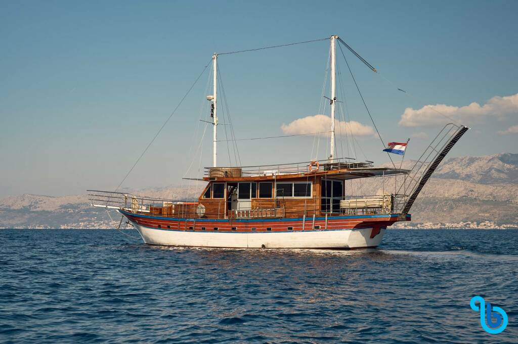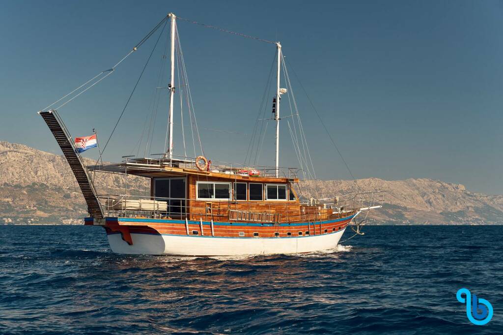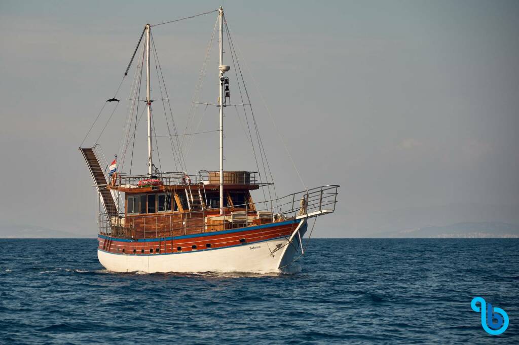 Goleta Trebenna Trebenna, construido en 1987 está anclado en Croacia. Tiene 4 cabinas, puede acomodar 8 personas.