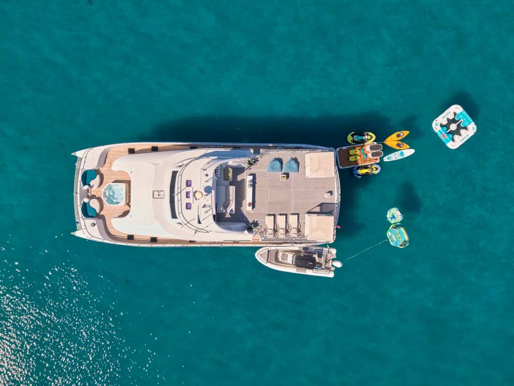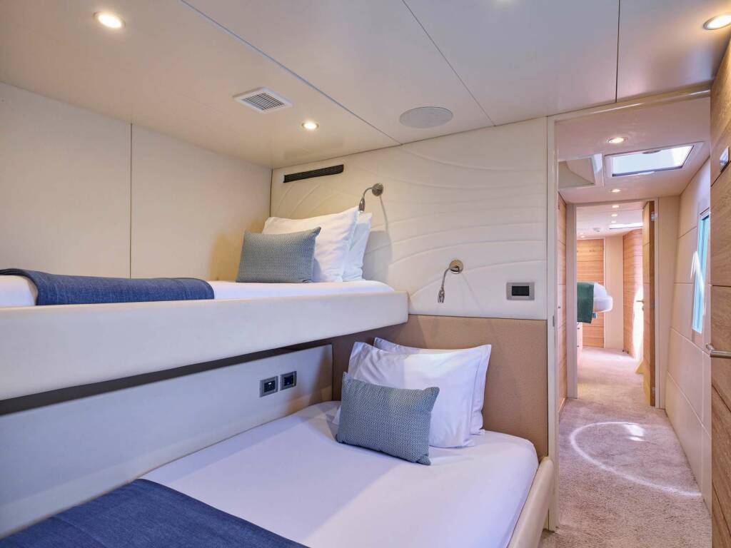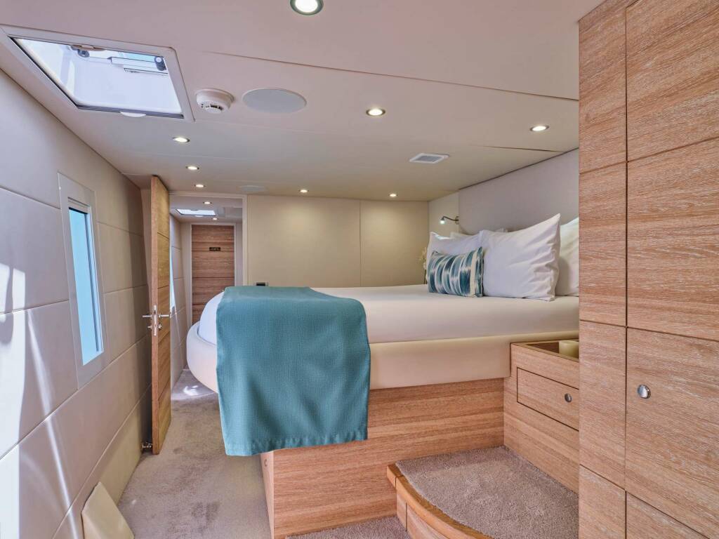 Accommodation: Master on main deck with direct access to outdoor Jacuzzi, two Queen staterooms, each en suite with spacious showers, toilet and ample storage in two closets and cabinetry. Aft in the starboard hull 2-3 more guests can find accommodation in a double bed with pullman bunk, also with en suite facilities.