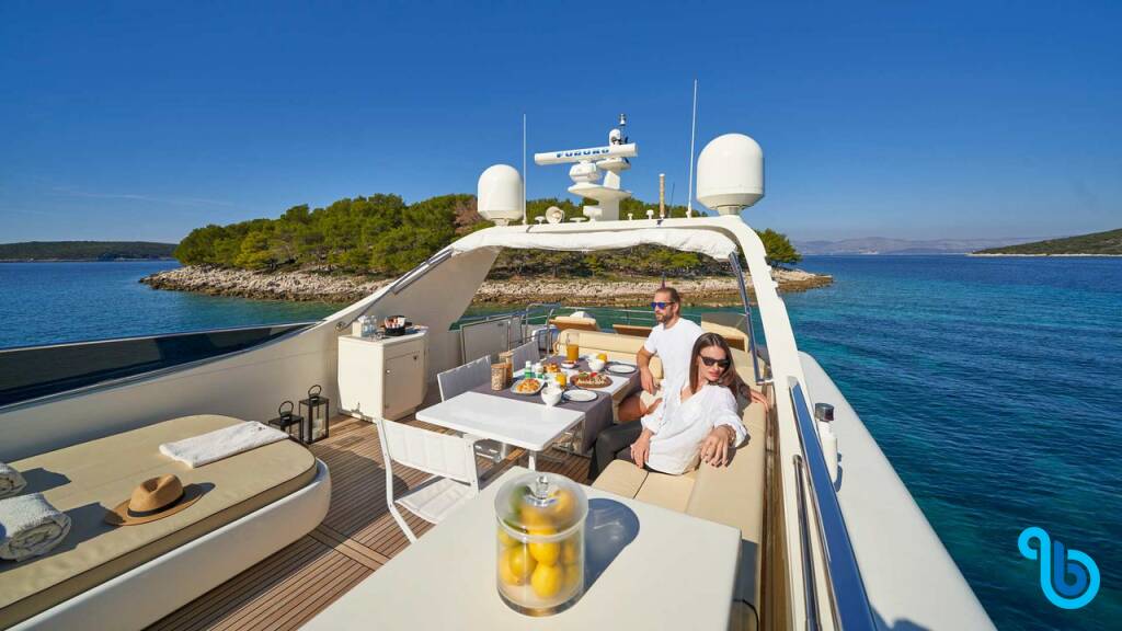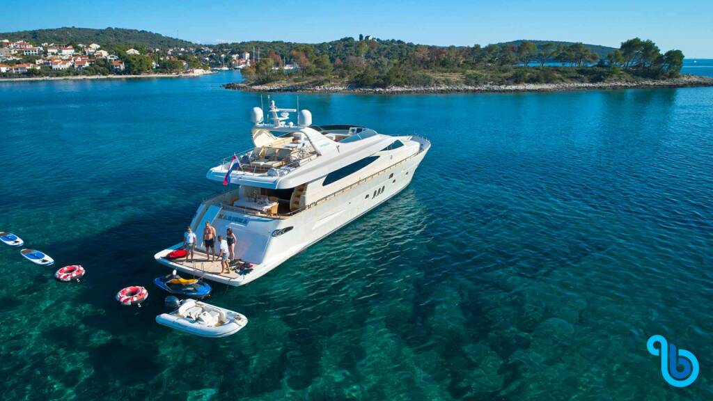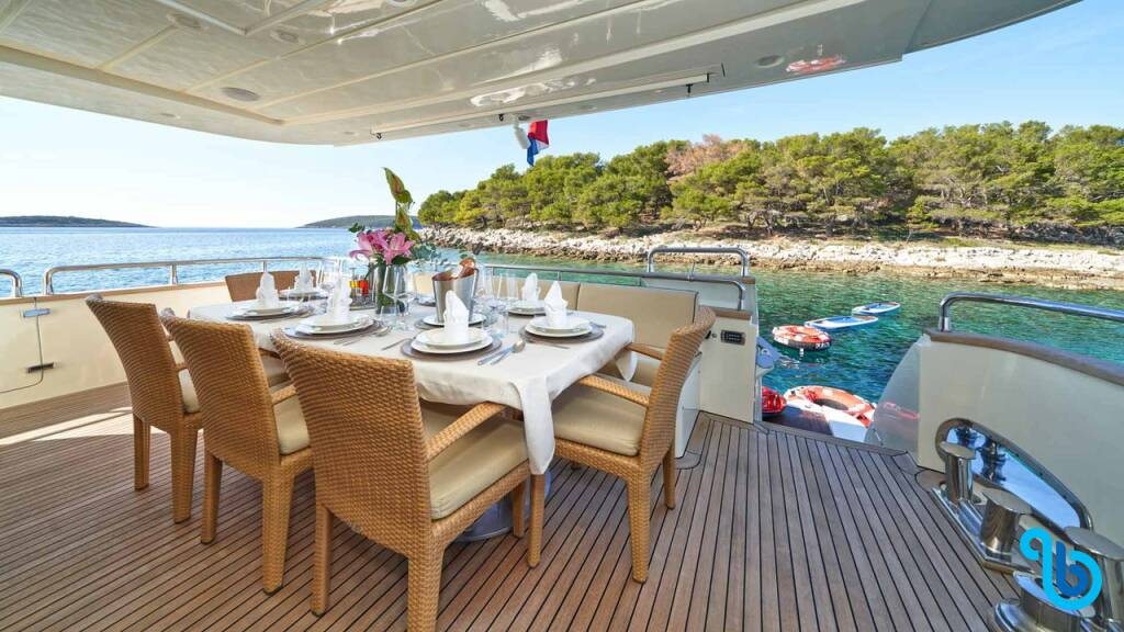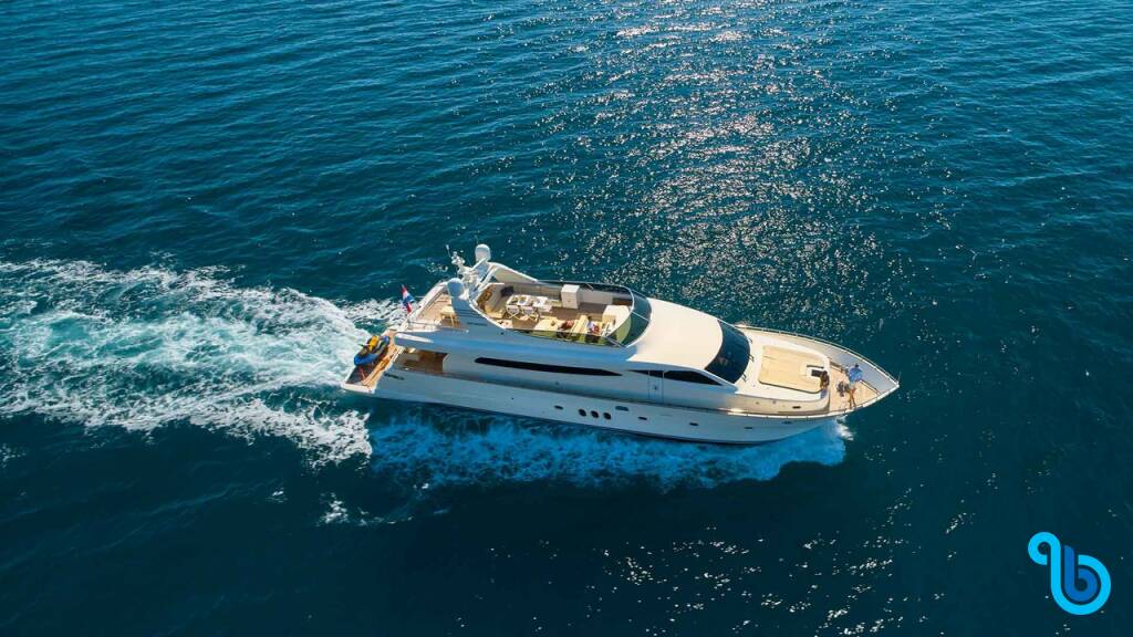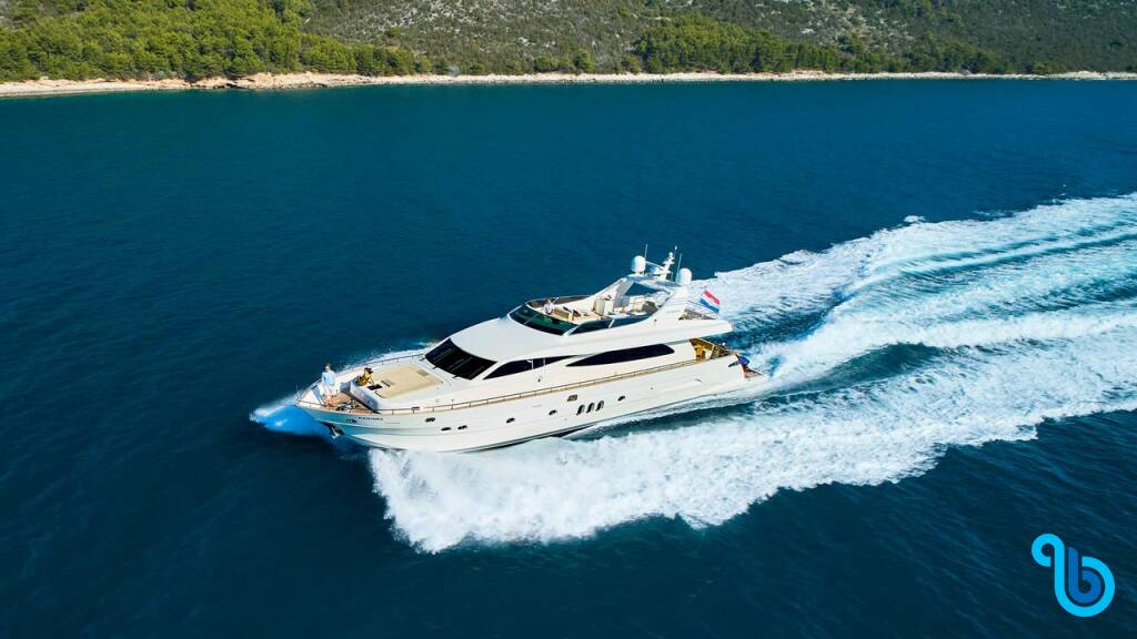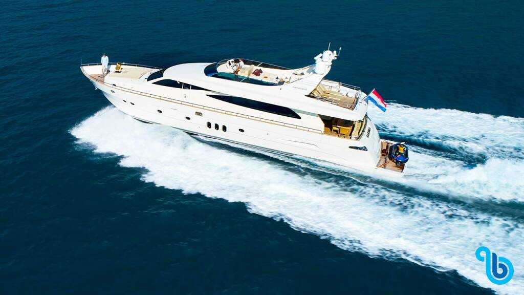 Yate de lujo a motor Canados 86 Karisma, construido en 2008 está anclado en Croacia. Tiene 4 cabinas, puede acomodar 8 personas.