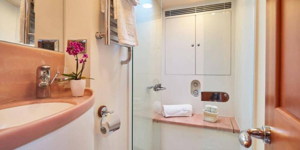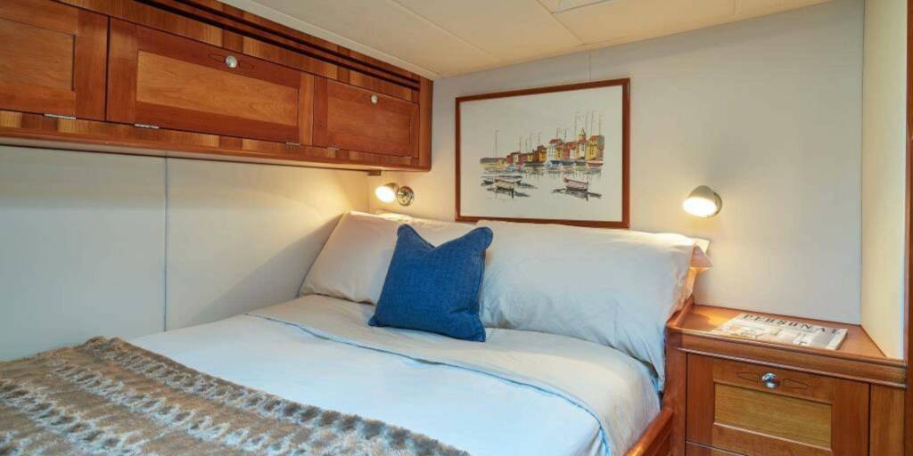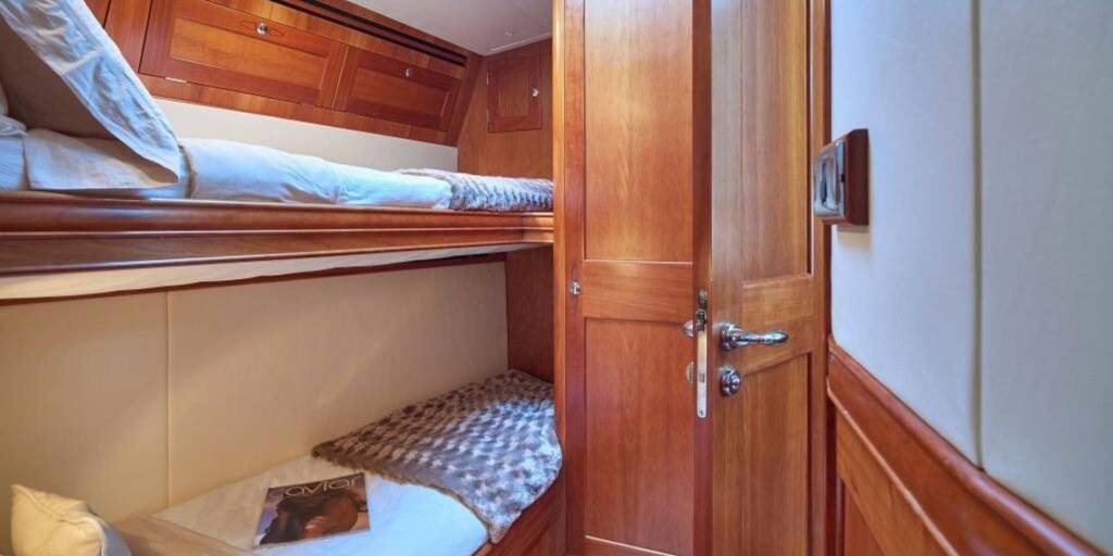 Accommodation: DARK STAR OF LONDON accommodates up to 10 guests in 5 elegant and harmonious cabins. The master suite is around 12 m2, full beam of the yacht forward with a double bed, seating area and has full-size en-suite shower room. Aft of the master on port and starboard are 2 mirror image doubles and 2 twin bunk cabins, around 7 m2 each and each has en-suite head compartment.