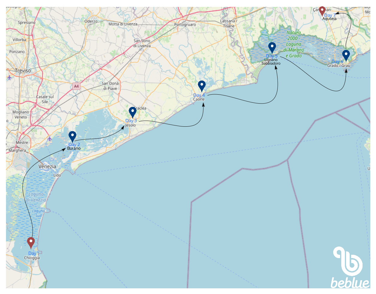 Un classico della navigazione, uno scenario tra i più vari ed imprevisti: dai casoni dei pescatori ai palazzi del Canal Grande, dagli ampi estuari dei fiumi Veneti ai verdi paesaggi tagliati nei canneti, da una campagna operosa ad una spiaggia oziosa.