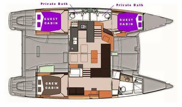 Accommodation: Nestled along the port-side hull, both queen cabins offer their own ensuite head and shower for added comfort and privacy.