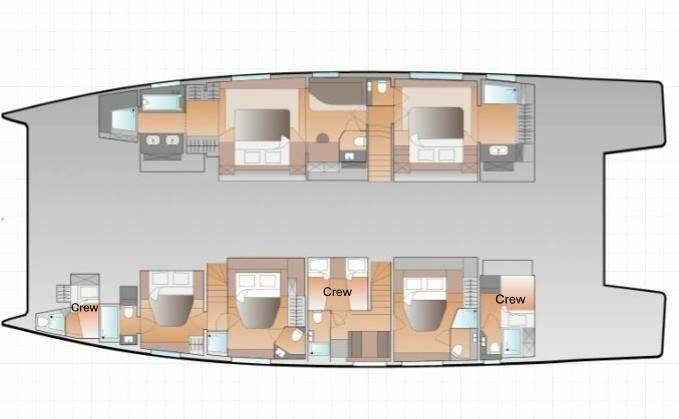 Accommodation: One owner's suite with jacuzzi bathtub and separate shower (bed size 1,80 m x 2,00 m), one VIP cabin with desk area (bed size 1,80 m x 2,00 m), and three queen bed cabins (bed size 1,60 m x 2,00 m), all with private facilities.