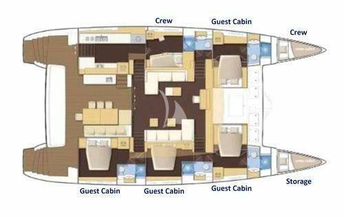 Accommodation: In the starboard hull there are three generous double suites; the aft and amidships cabins are slightly larger, but all benefit from ensuite bathroom facilities. The port hull houses the fourth guest suite and benefits from private access plus there is a cabin for the crew with access from the galley.