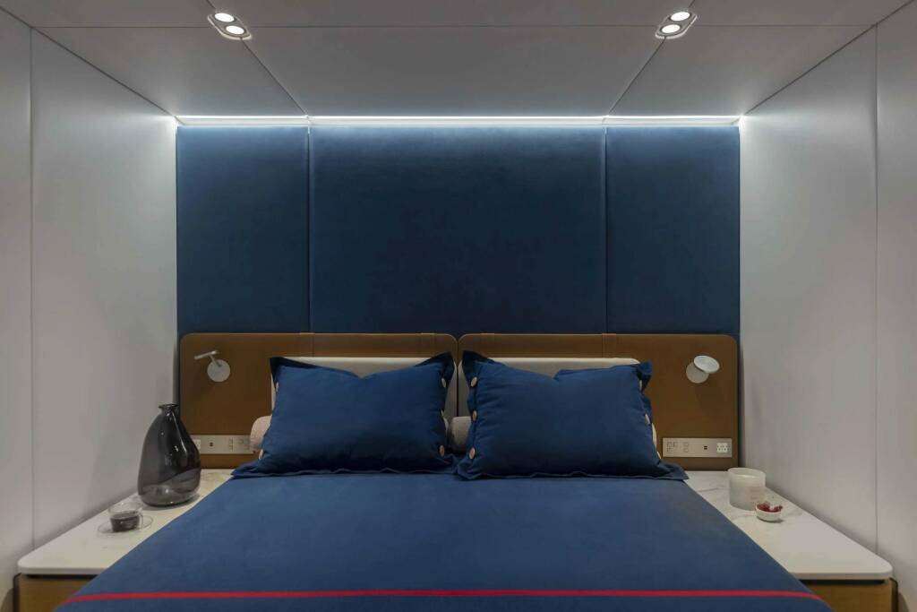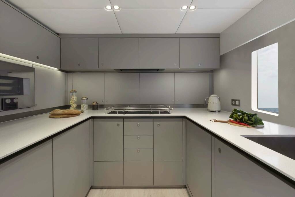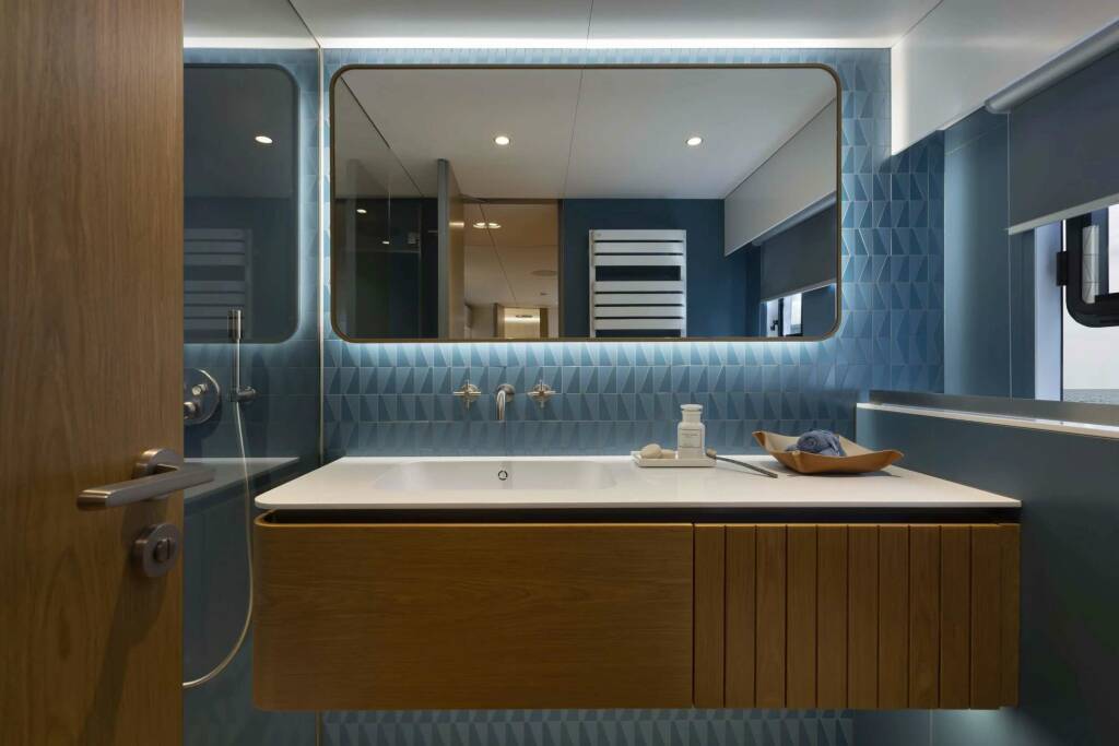 Accommodation: The four guest cabins are thoughtfully arranged, with a spacious master suite with king berth in the port hull, a double midships cabin, a twin forward cabin, and an aft cabin featuring a double bed plus a Pullman in the starboard hull. Each cabin offers the comfort and privacy of ensuite facilities, with the master distinguished by striking azure blue tiling and an expansive shower cubicle. The remaining suites continue the theme, accented with touches of azure blue and clean, contemporary lines.