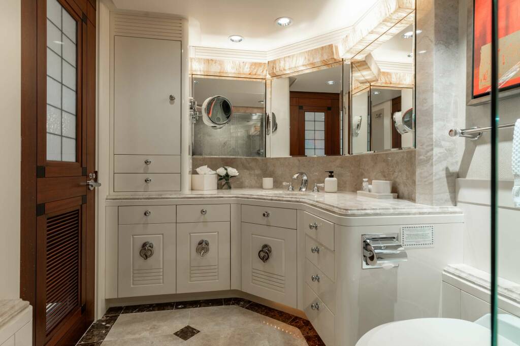 Accommodation: Master Stateroom on deck - walk around king size bed with master bathroom with large enclosed shower and double vanity.